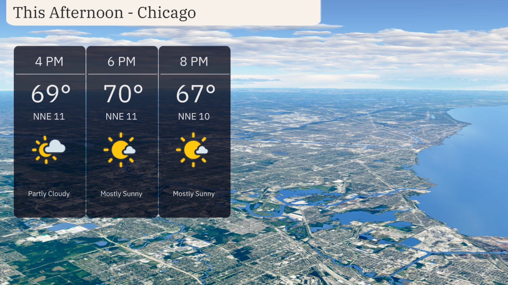 This afternoon in Chicago, expect temperatures to peak at around 70 degrees by 6 PM. Winds from the north-northeast at 11 miles per hour will provide a gentle breeze. The sky will transition from partly cloudy to mostly sunny as the afternoon progresses. By 8 PM, temperatures will ease down to 67 degrees under a mostly sunny sky.