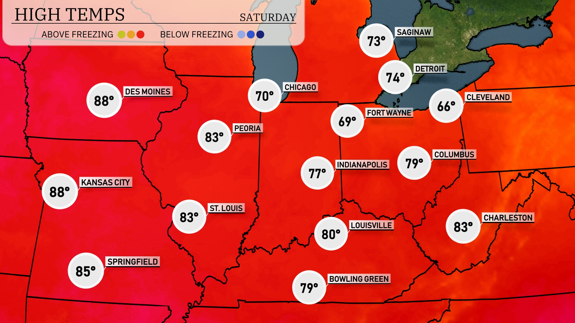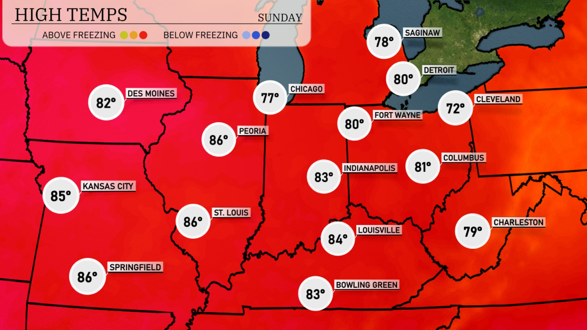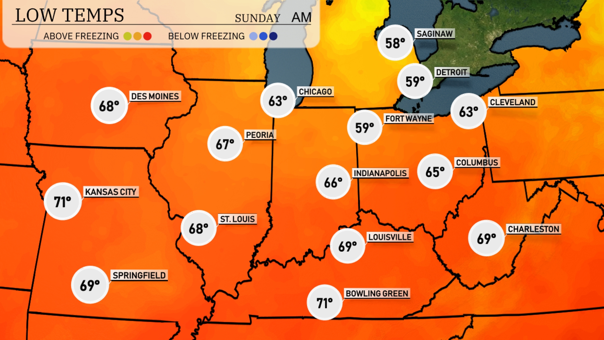 Tonight, Des Moines will cool down to 68 degrees. Chicago is expected to see a low of 63, while Indianapolis will dip to 66. St. Louis is looking at a mild 68, and Louisville will have a low temperature of 69.