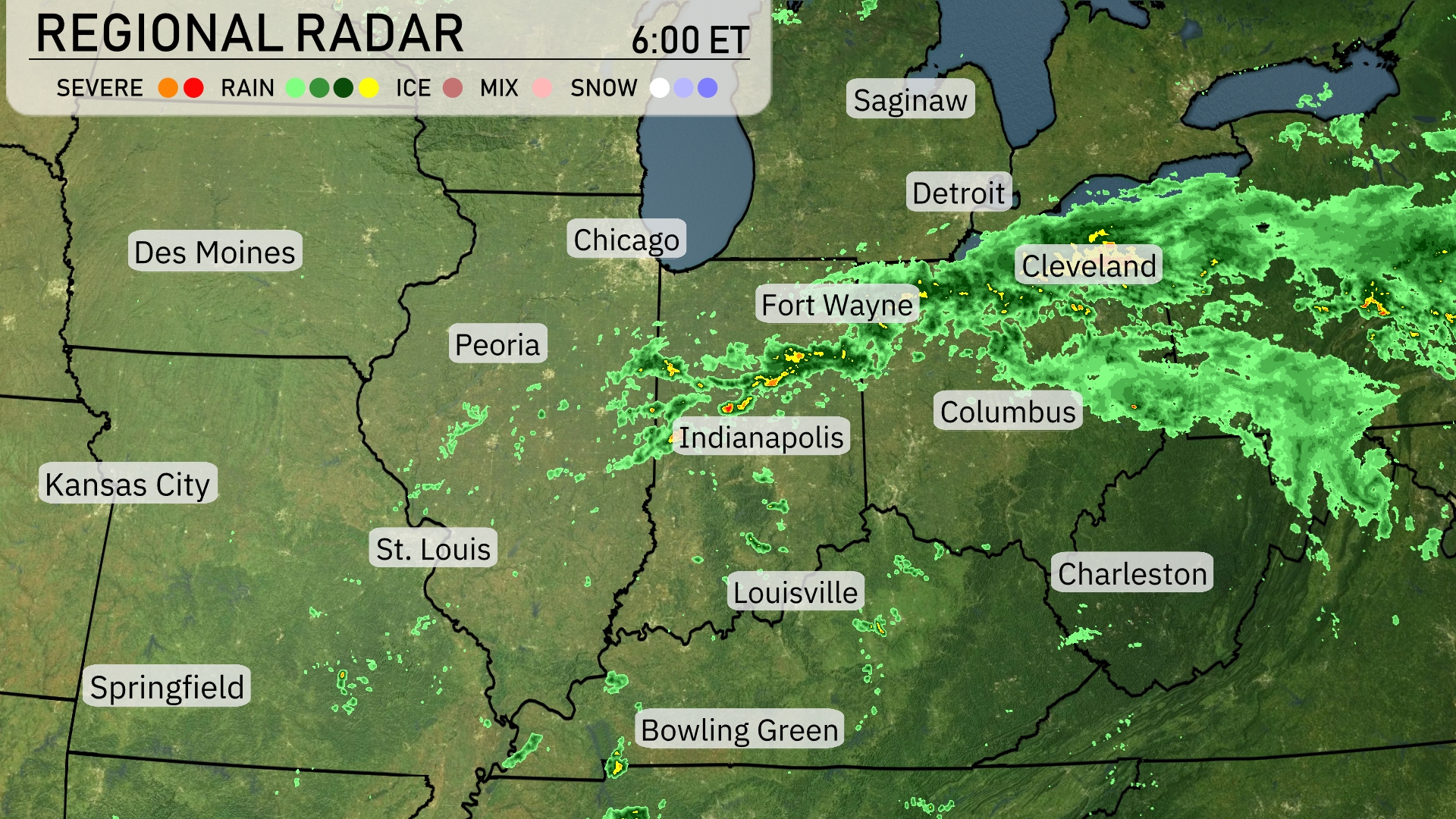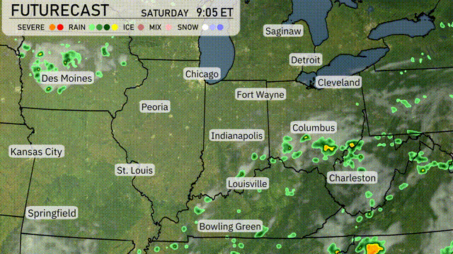 Rain showers and isolated thunderstorms will impact the Midwest tomorrow from Des Moines to Indianapolis. Expect moderate rain over Peoria and Bowling Green, with the potential for localized flooding. Cooler temperatures will spread across Fort Wayne and Detroit due to a passing cold front. The afternoon may see more scattered showers around Cleveland.