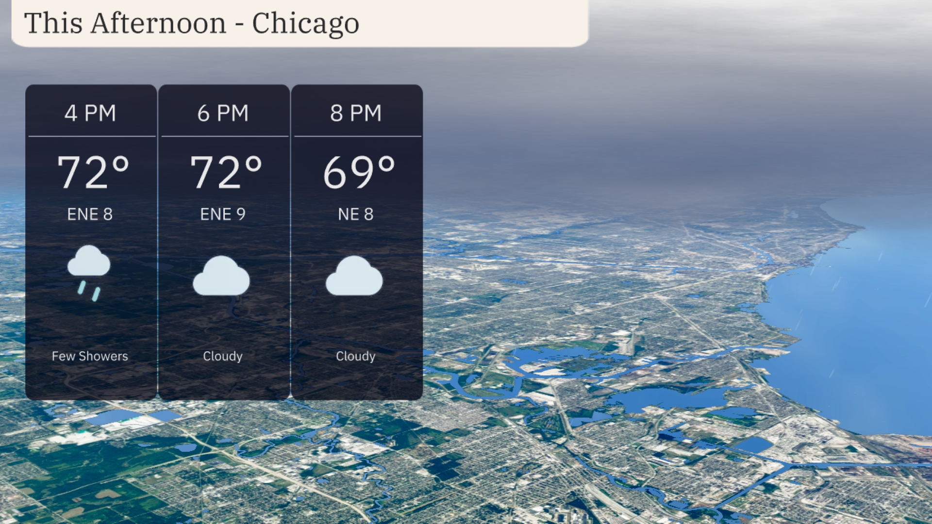 In Chicago this afternoon, expect temperatures to hold steady at 72 degrees by 4 PM with an east-northeast wind around 8 miles per hour, occasionally gusting higher. A few showers are possible later in the afternoon as cloudy conditions persist. As we move towards the evening, the temperature will gently drop to 69 degrees by 8 PM, with continued cloud cover.
