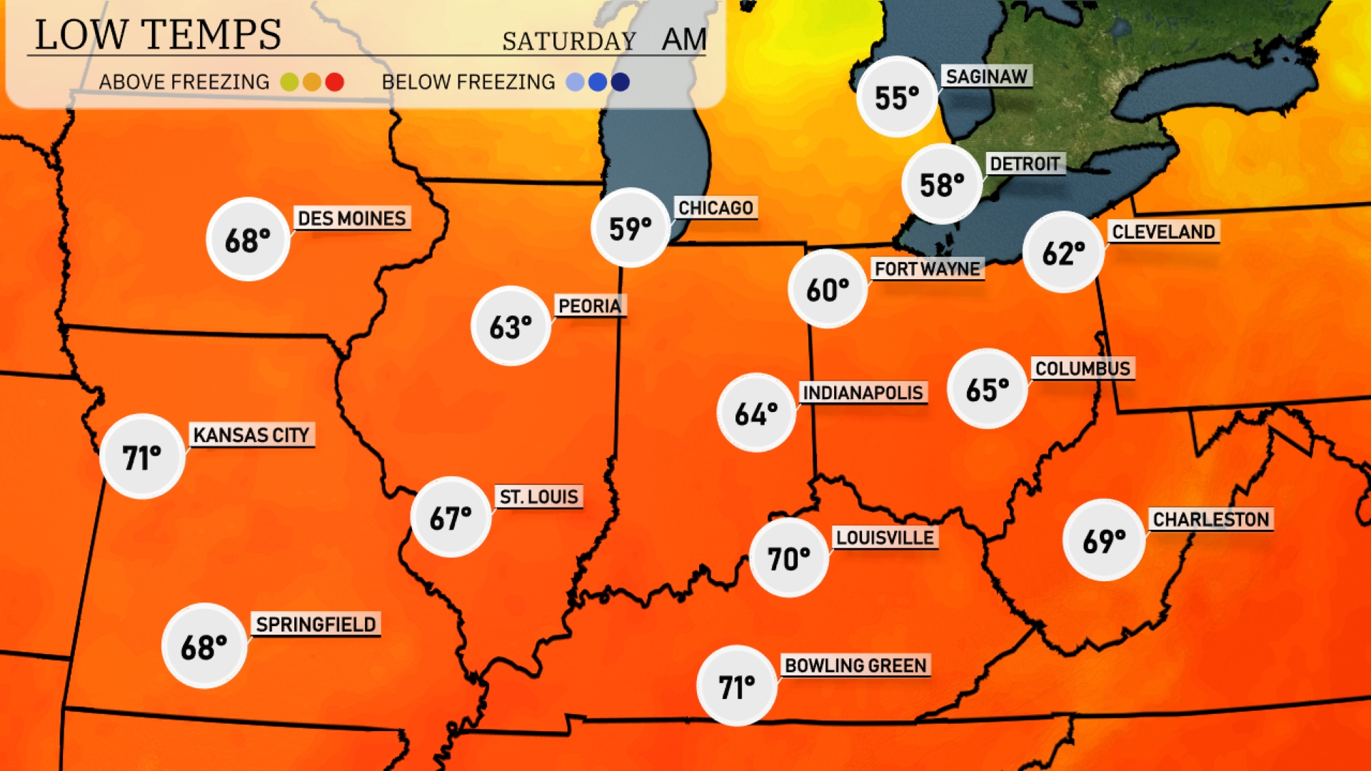 Tonight in the Midwest, expect lows around 55 degrees in Saginaw and 58 in Detroit. Chicago will cool down to 59 degrees, while Fort Wayne reaches 60 degrees. Farther south, Louisville is expected to dip to 70, with Kansas City slightly warmer at 71 degrees.