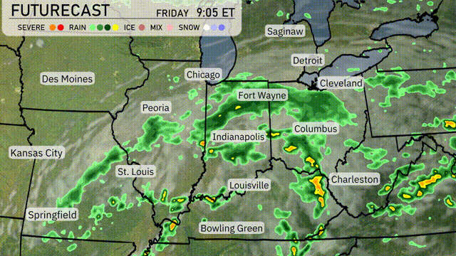 Expect a wet day across the Midwest tomorrow as a low-pressure system drives moisture through the region. Areas from St. Louis to Indianapolis will see widespread showers with embedded thunderstorms, bringing locally heavy downpours. Stronger storms may briefly cause gusty winds and lightning, so keep an eye on the skies. As the system continues eastward, Louisville to Columbus should prepare for a soggy day, with potential flooding in low-lying areas.