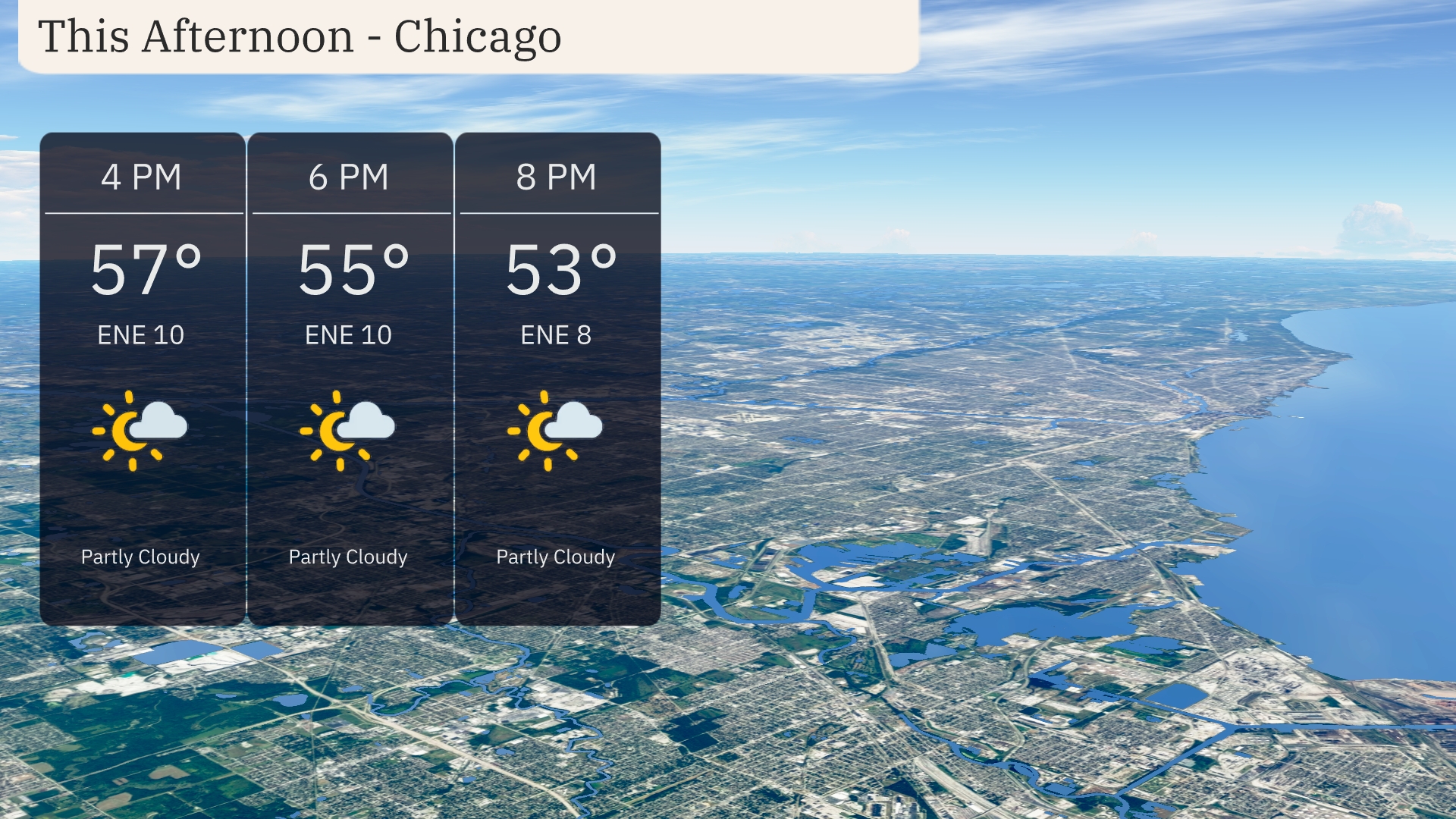 Temperatures in Chicago this afternoon will peak at 57 degrees with partly cloudy skies. Winds will be coming from the east-northeast at 10 miles per hour. By 6 PM, temperatures dip slightly to 55 degrees as clouds persist. Expect the temperatures to continue falling to 53 degrees by 8 PM with winds easing to 8 miles per hour.
