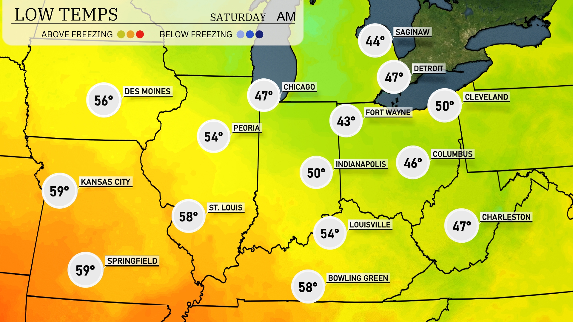 Tonight Chicago will drop to 47 degrees, while Indianapolis will see a low of 50. Fort Wayne is forecasted to reach 43 degrees, a significant dip for the region. Over in Peoria, expect a low of 54, and Columbus will cool down to 46 degrees. Des Moines may wakes up to more mild conditions at 56 degrees.