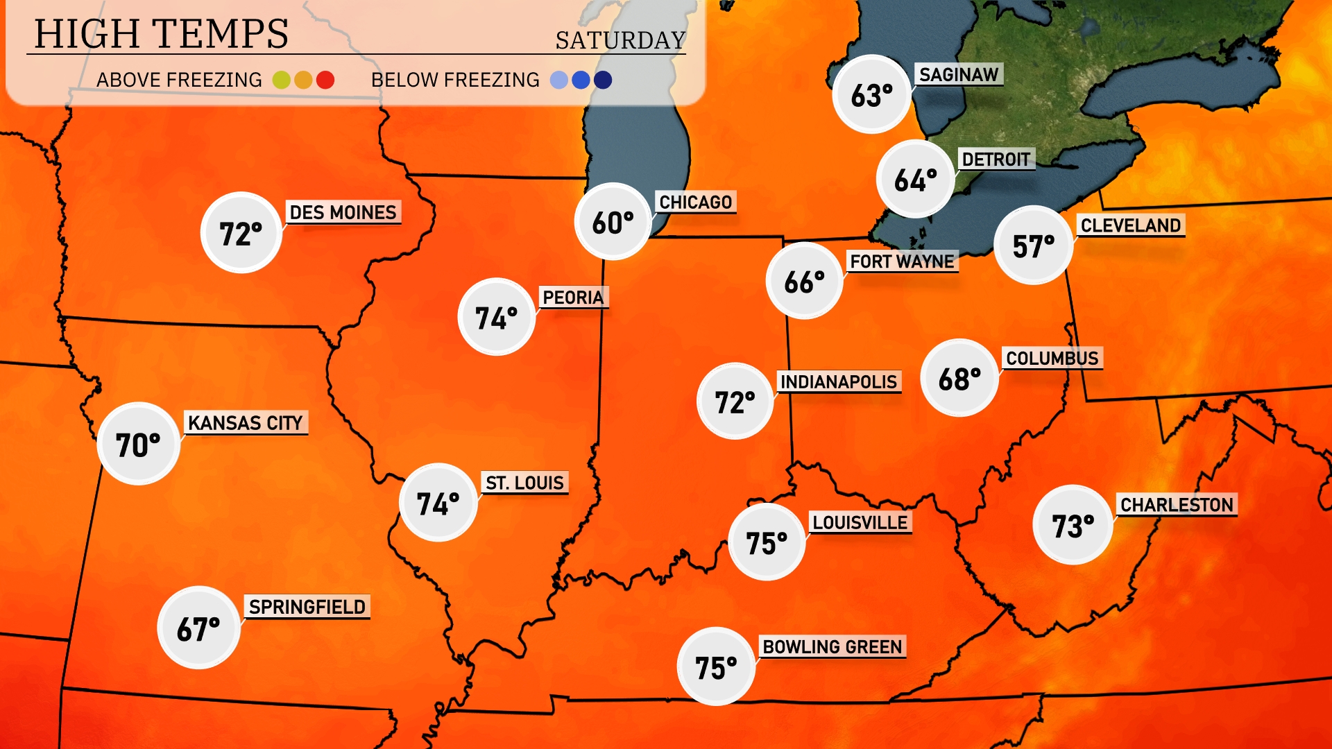 This afternoon in Des Moines, we can expect a high of 69 degrees, while Kansas City will see a similar temperature at 69 as well. St. Louis is warming up to a nice 72 degrees. Indianapolis is on the cooler side with a high of 68, but further south, Louisville will hit 71 degrees. Over in Peoria, temperatures reach 71 degrees, and Bowling Green is leading the way with a high of 73. Cool air is settling in across the northern parts, with Chicago only reaching 57 degrees and Detroit at 57 degrees as well.