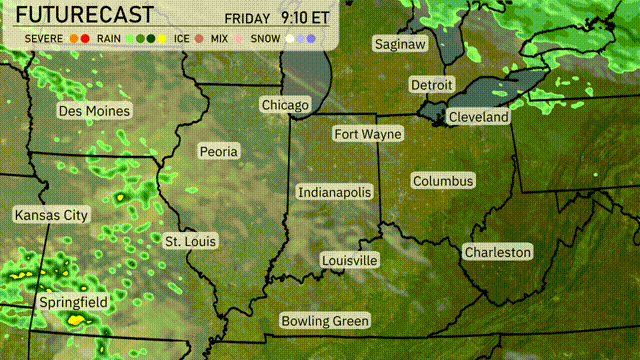 A calms day is unfolding across much of the Midwest, but there are light showers creeping towards Cleveland and Detroit from the northeast. The areas around Indianapolis and Fort Wayne are seeing pockets of light rain, which are drifting southeast. While the bulk of the traditional storm-prone areas like Des Moines and St. Louis remain dry, Springfield and Chicago enjoy clear skies as well. Outside the localized rain, the rest of the Midwest, including cities like Louisville and Bowling Green, enjoys dry and tranquil conditions.