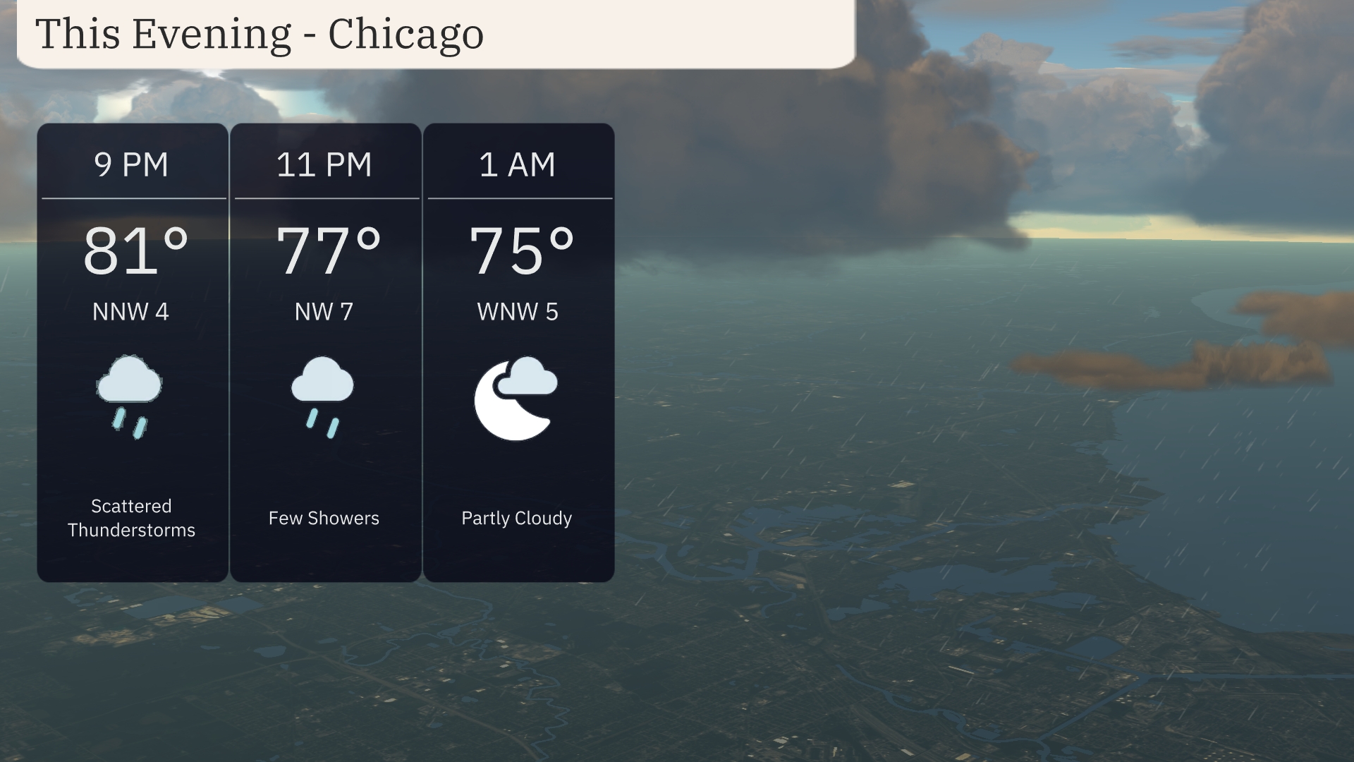 For this evening in Chicago, expect scattered thunderstorms starting with temperatures around 81 degrees at 9 PM and a north-northwest wind at 4 mph. By 11 PM, the temperature dips to 77 degrees with a few showers possible, as winds increase to 7 mph. As the night progresses to 1 AM, look for partly cloudy skies with temperatures settling at 75 degrees and winds from the west-northwest at 5 mph.