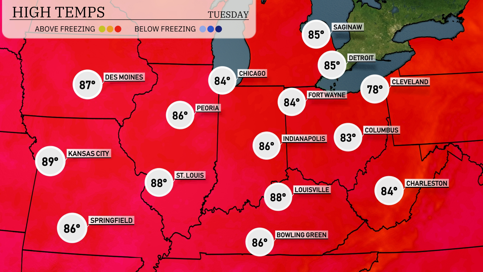 Tomorrow, Kansas City will sizzle with a high of 89 degrees, while St. Louis is expected to reach 88. Indianapolis and Louisville both look to see warm temperatures of 86 degrees. Further north, Chicago will enjoy a pleasant high of 84 degrees.