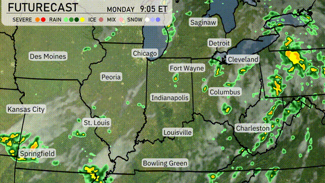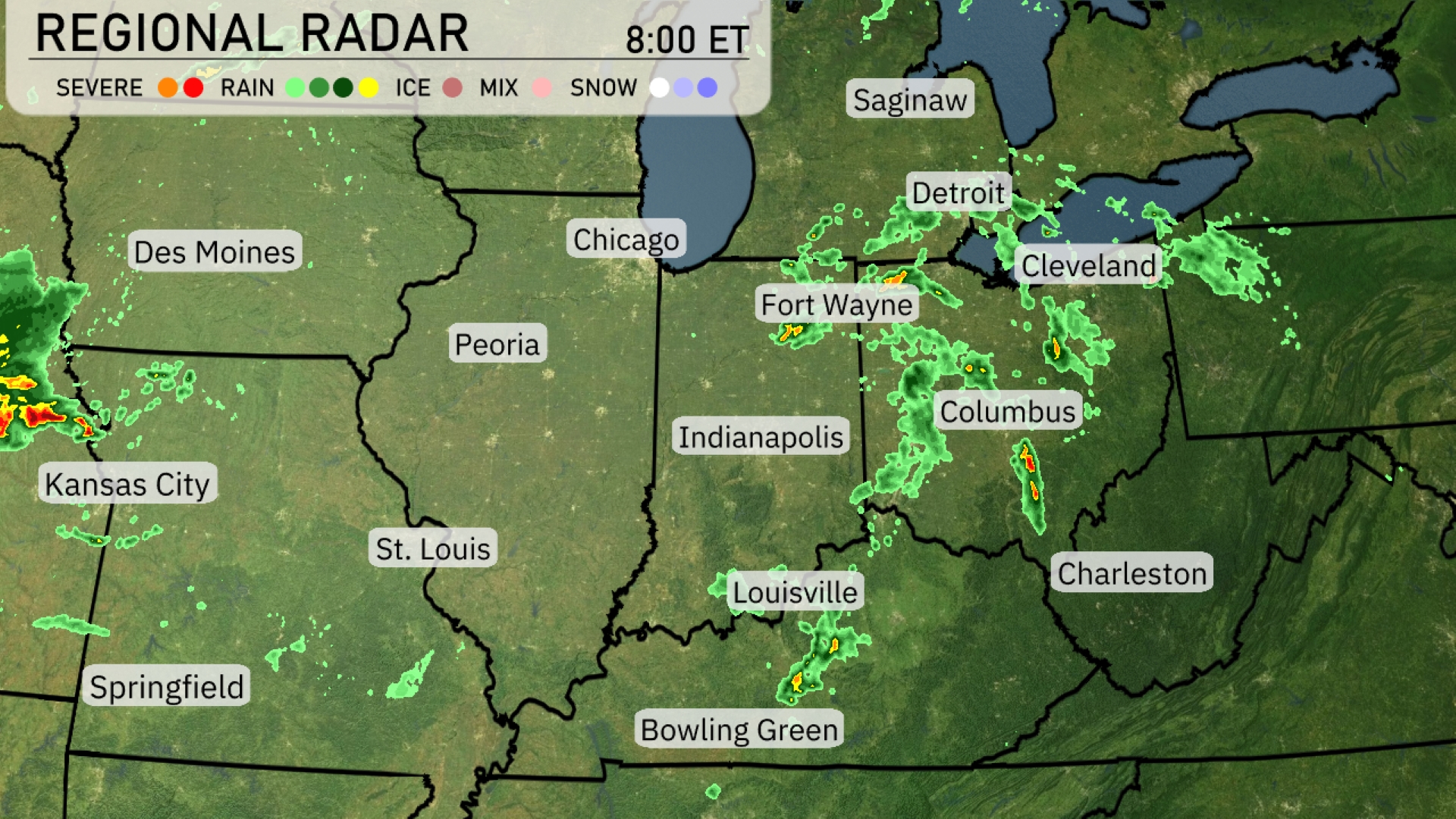 A strong line of storms is developing over Kansas City, moving east toward St. Louis. Detroit and Cleveland are experiencing scattered showers with more rain tracking northeast. Fort Wayne and Columbus are also seeing steady rain, which is expected to persist through the evening. Indianapolis and Bowling Green are watching for isolated storms, while conditions clear out a bit further south near Charleston.