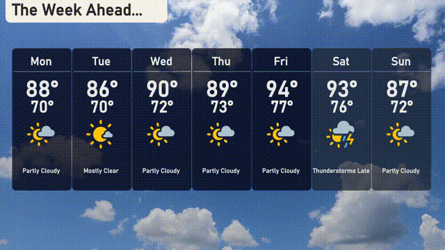 Sunday: Partly cloudy skies return, with a high of 87 degrees and a low of 72 degrees.