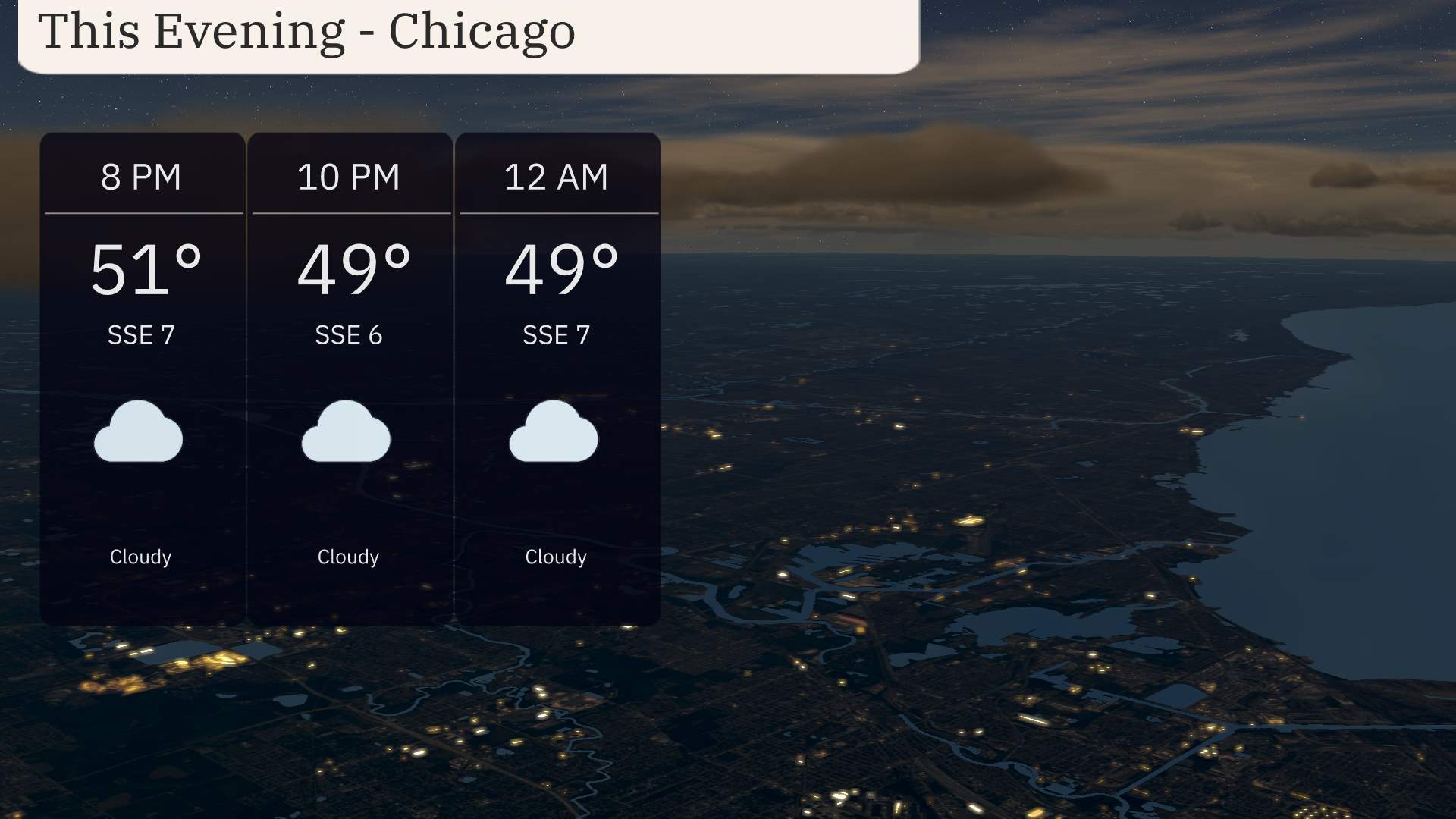 For this evening in Chicago, skies will remain cloudy with a steady breeze from the south-southeast. Temperatures will start at 51 degrees at 8 PM, cooling slightly to 49 degrees by 10 PM, and holding at 49 degrees through midnight. Expect consistent cloud cover and a light breeze, with winds around 7 miles per hour.