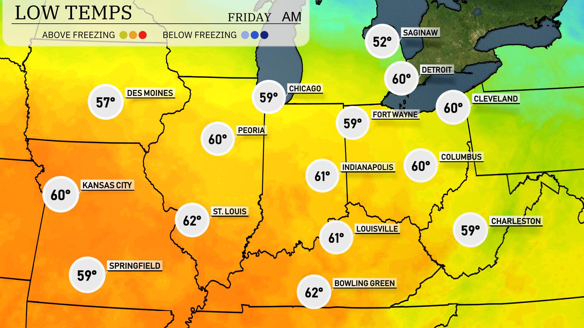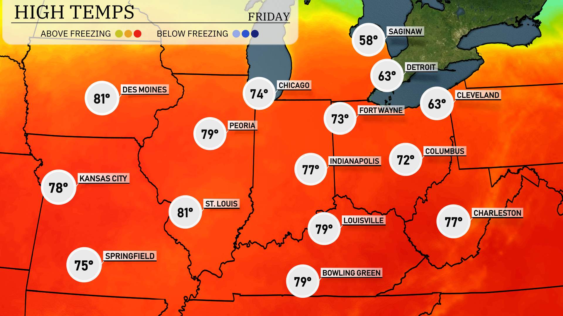 Kansas City is looking at a high of 78 degrees, while Springfield will enjoy a comfortable 75. St. Louis is set for a high of 81 degrees, making it one of the warmer spots in the region. Peoria will follow closely at 79 degrees, with Indianapolis expecting a high of 77.