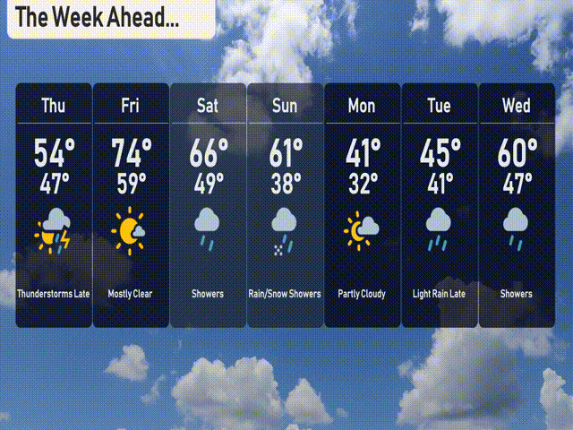 Thursday: Expect thunderstorms late with a high of 54 degrees and a low of 47.