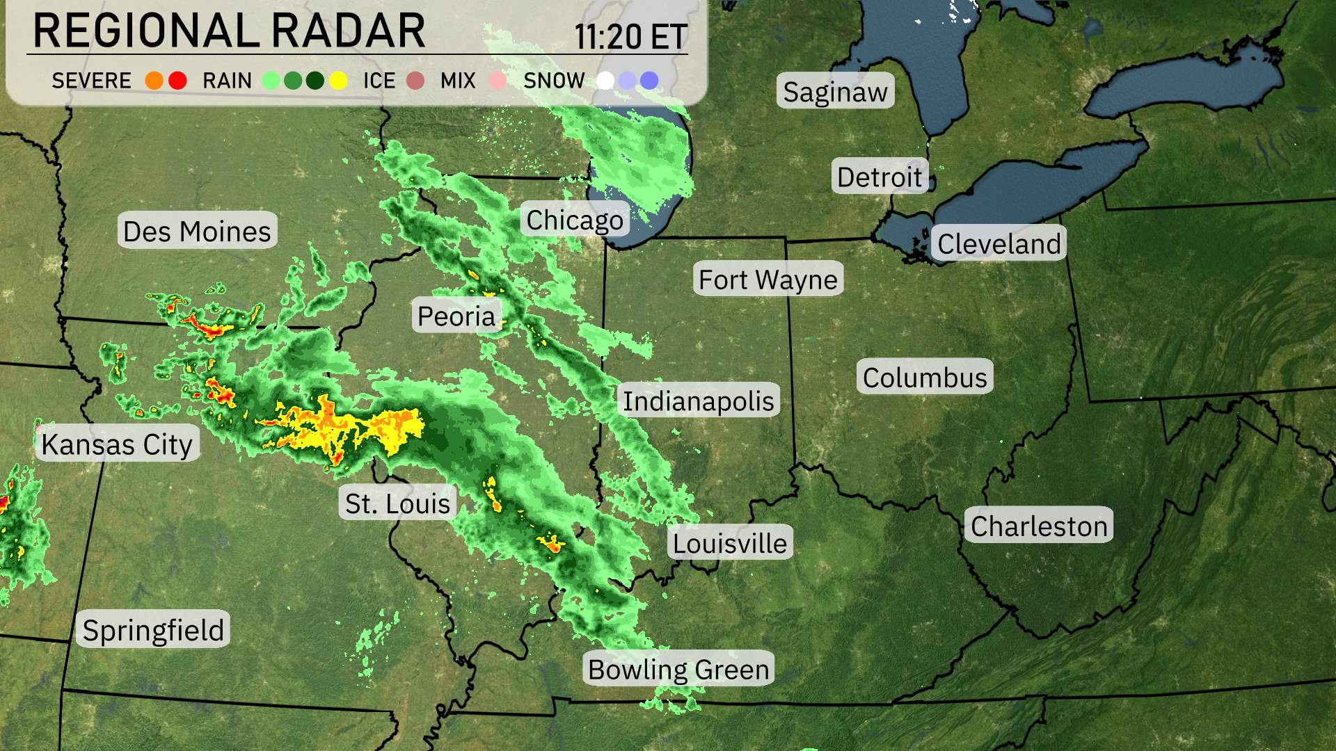 Across the Midwest, the regional radar shows an organized band of storms sweeping from western Missouri towards Illinois, with St. Louis currently experiencing heavy rain and potential severe storm conditions. Further north, areas like Springfield and Des Moines are under lighter rain, tapering off as we move towards Chicago, which is witnessing increasing cloud cover.