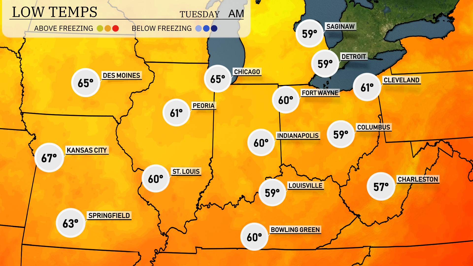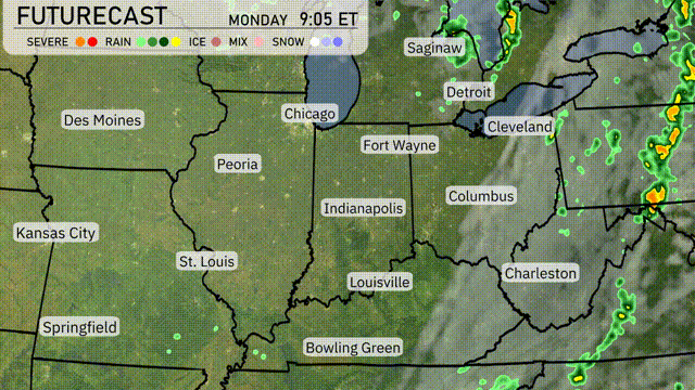 Tonight Chicago will see a low of 65 degrees, while Peoria and Indianapolis both drop to 60. Fort Wayne and Louisville will experience cooler conditions, with lows of 60 and 59, respectively. In Cleveland, temperatures will settle at 61 degrees.