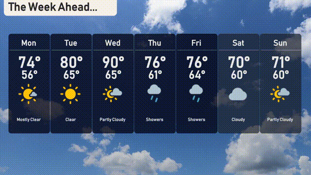 For the 7-day outlook in Chicago: Monday: Mostly clear skies with a high of 74 degrees and a low dipping to 56 degrees. Tuesday: Enjoy clear skies and warmer temperatures with a high of 80 degrees and a low of 65 degrees. Wednesday: Partly cloudy with a peak temperature of 90 degrees and a low of 65 degrees. Thursday: Showers are on the horizon with a high of 76 degrees and a low of 61 degrees. Friday: More showers continue with temperatures reaching a high of 76 degrees and a low of 64 degrees. Saturday: Cloudy conditions with a daytime high of 70 degrees and a low of 60 degrees. Sunday: End the week with partly cloudy skies, reaching a high of 71 degrees and a low of 60 degrees.