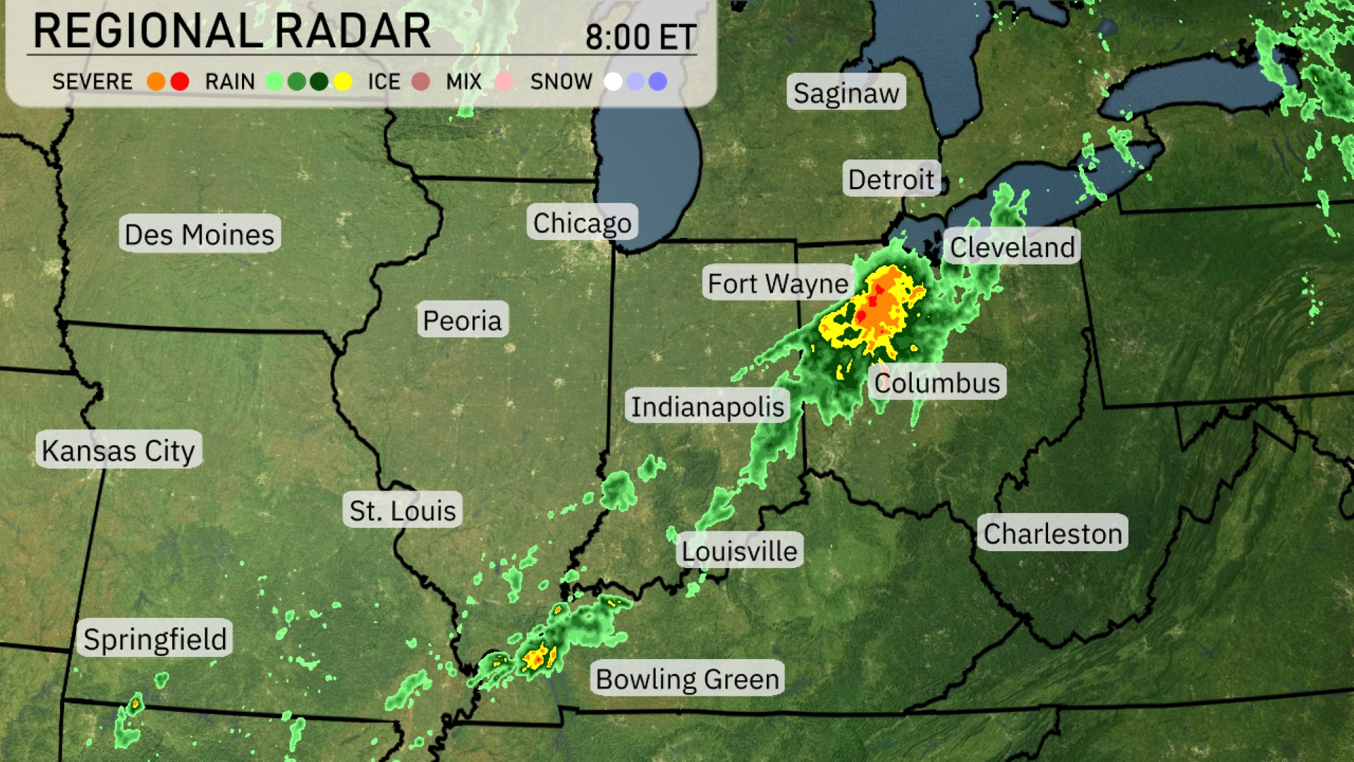 A line of thunderstorms is moving through the Midwest, with the most intense weather currently impacting Fort Wayne and Columbus. Heavy rain and storms are making their way towards Cleveland. Rain showers are trailing back towards Indianapolis, continuing southwest into Bowling Green. The rest of the region, including Chicago and Detroit, remains mostly clear, but clouds are beginning to increase over these areas.