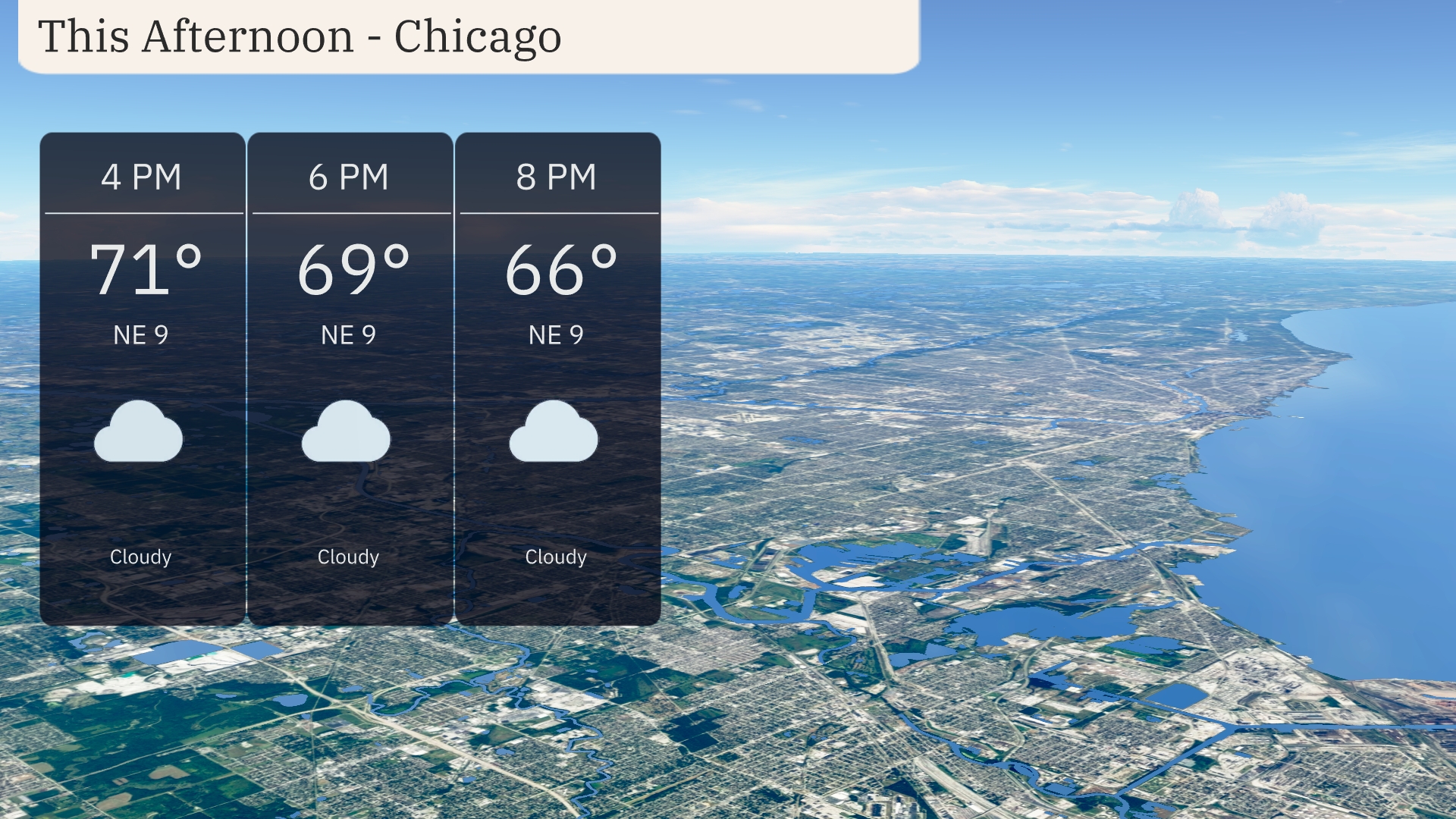 Afternoon temperatures in Chicago will peak at 71 degrees around 4 PM, with a steady northeast wind at 9 miles per hour. Cloudy skies will persist through the afternoon, maintaining a calm weather pattern. By 6 PM, expect temperatures to gently lower to 69 degrees. As evening approaches, temperatures will ease to 66 degrees by 8 PM, with the cloudy conditions continuing.