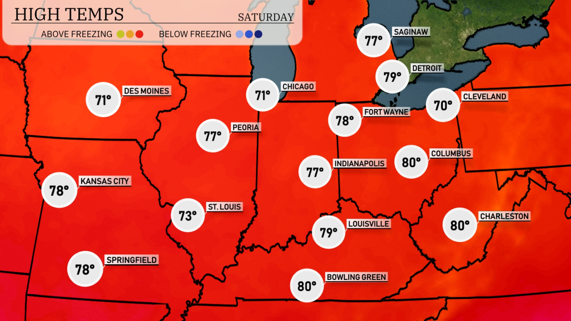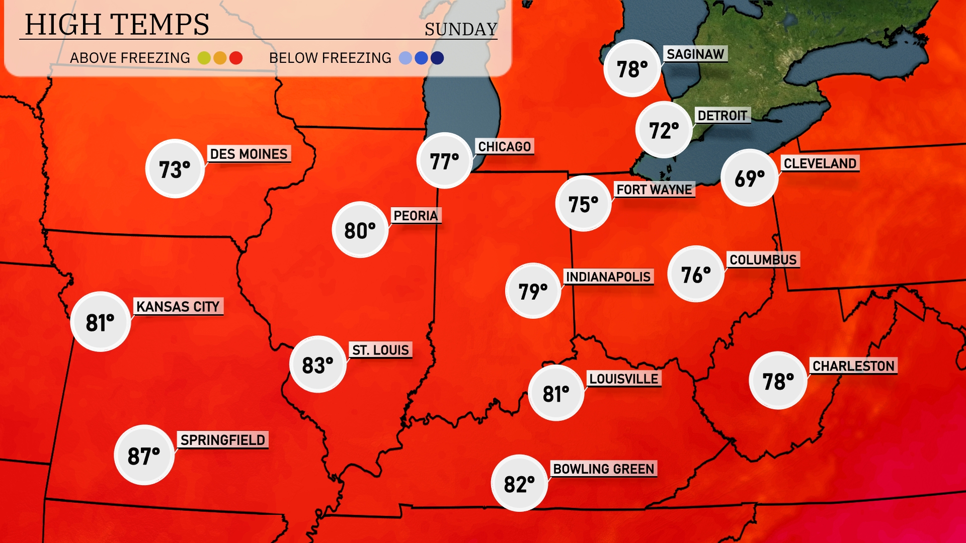 Tomorrow, the Midwest is set for warm weather with highs reaching 87 degrees in Springfield and 83 degrees in St. Louis. Kansas City will warm up to 81 degrees, while Peoria is expected to see a high of 80 degrees. Indianapolis and Louisville will both enjoy temperatures around 79 and 81 degrees, respectively.