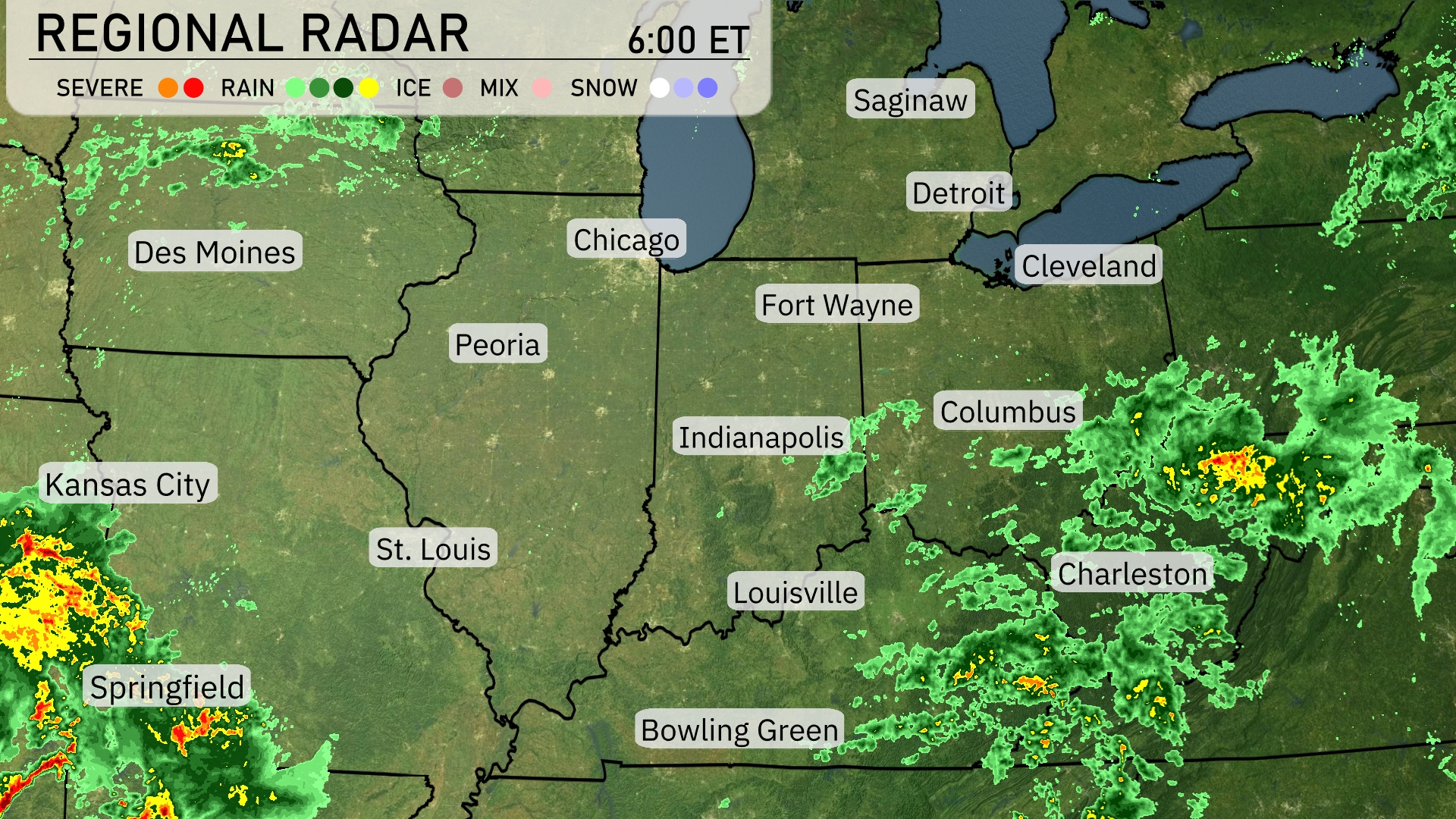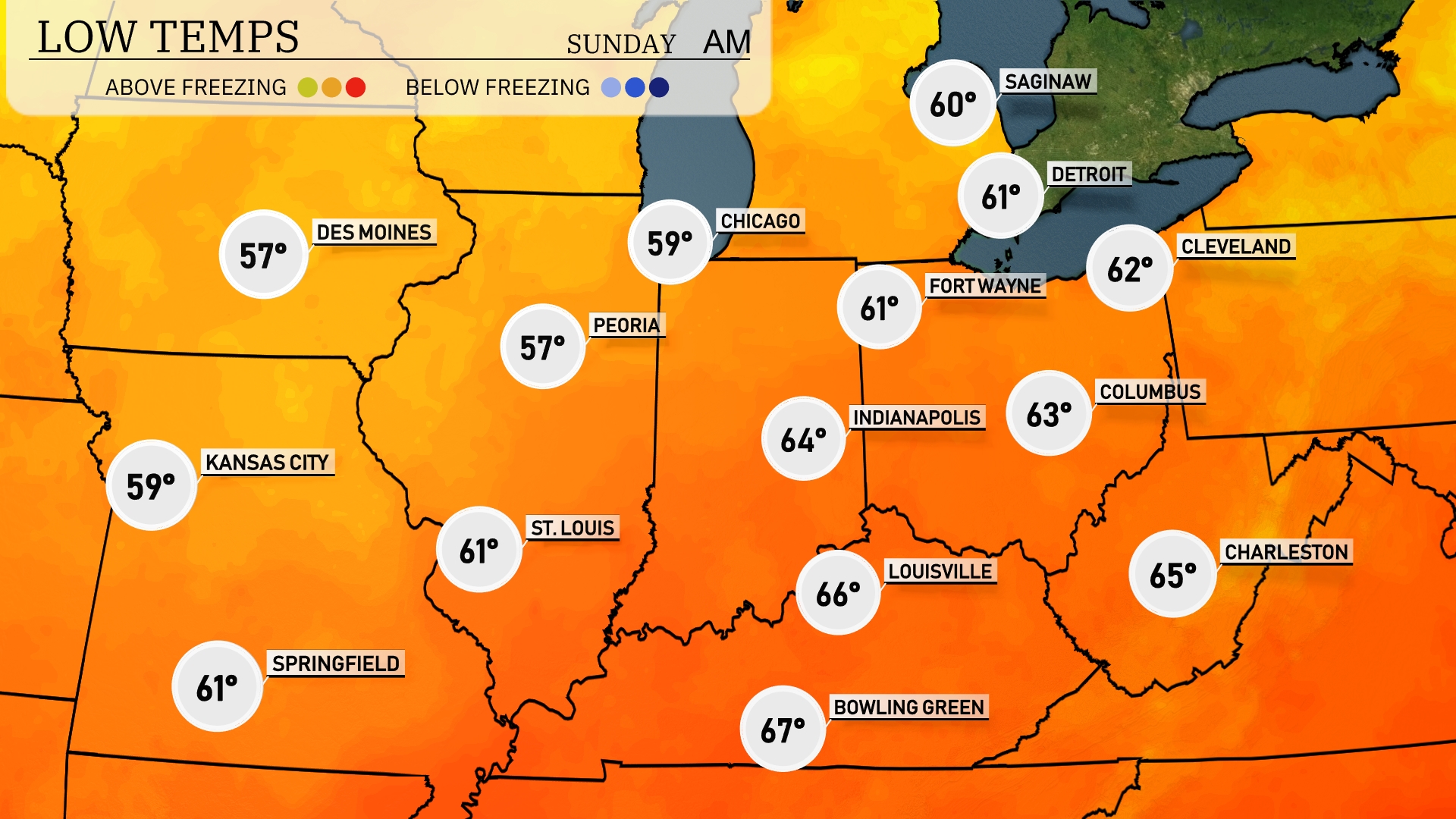 Tonight, Chicago will see a low of 59 degrees, while Peoria drops to 57. Indianapolis is forecasted to be slightly warmer at 64 degrees. Expect Kansas City to have a low of 59, and St. Louis will cool down to 61.