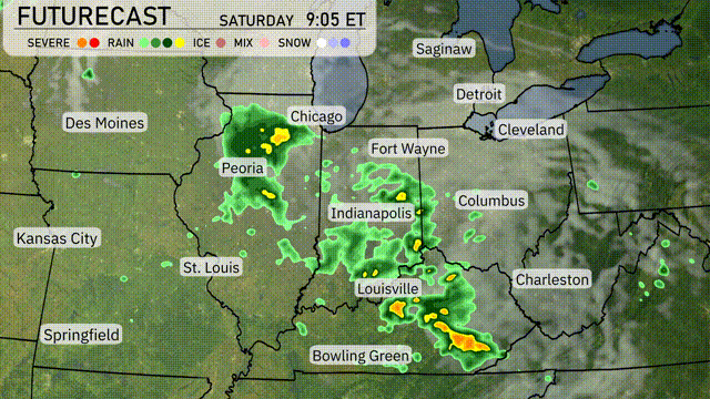 A line of intense thunderstorms is forecasted to sweep through the Midwest, starting late tonight. From Chicago to Indianapolis and Louisville, expect heavy rain leading to potential flooding, with areas receiving over an inch in a short period. Severe weather risks include damaging winds, especially in Peoria and Bowling Green, as the cold front moves eastward. Cooler, drier air will settle in post-frontal passage by tomorrow evening.