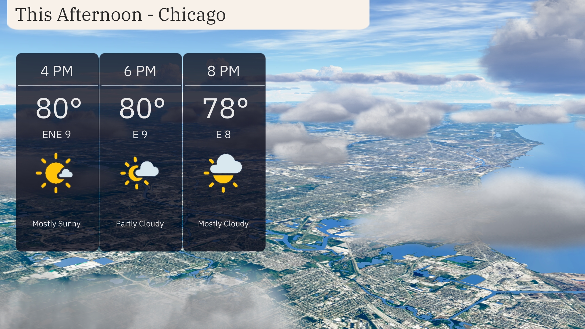 Chicago this afternoon will see temperatures peaking at 80 degrees with an east-northeast wind around 9 miles per hour. Skies start mostly sunny, transitioning to partly cloudy by 6 PM. As the evening progresses, expect it to become mostly cloudy with temperatures gently dropping to 78 degrees by 8 PM.