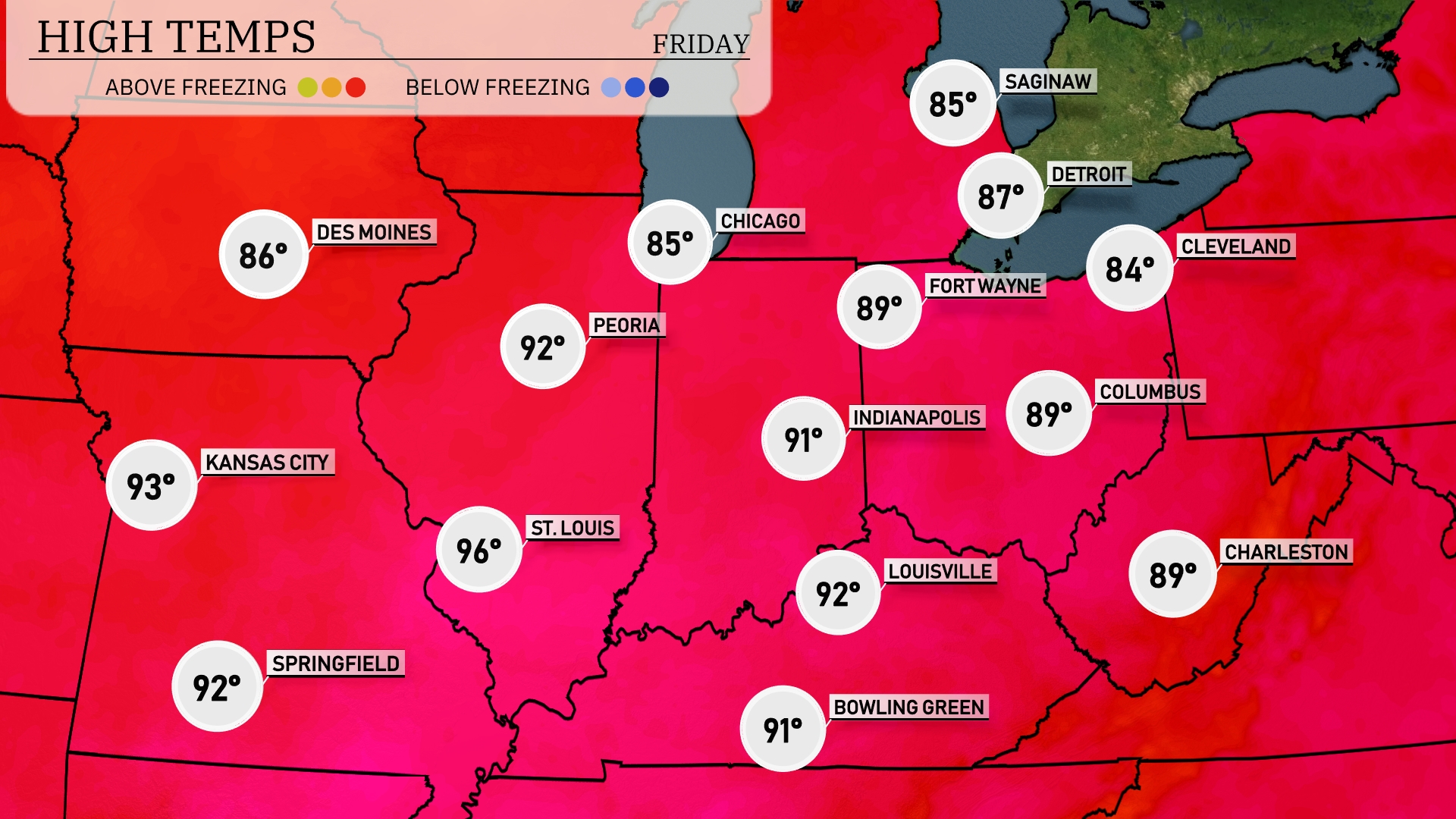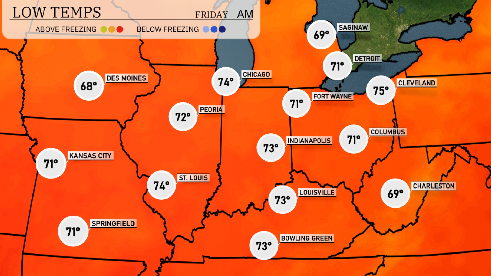 Tonight, Chicago will see a low of 74 degrees. Kansas City cools down to 71, while Indianapolis will hover around 73. St. Louis is expected to reach a low of 74, and Louisville will also stay mild at 73. Expect slightly cooler conditions in Fort Wayne, with a low of 71 degrees.