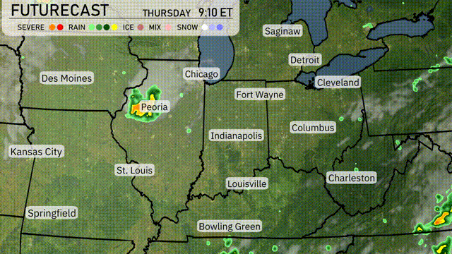 A cold front is pushing through the Midwest, bringing scattered thunderstorms from Des Moines to Springfield overnight. Expect gusty winds and localized heavy rain, particularly near Peoria by mid-morning. As the system progresses eastward, Chicago and Fort Wayne will see increased storm activity by late afternoon. Keep an eye on potential severe weather from Indianapolis to Louisville, where isolated strong storms could develop. Cooling temperatures will follow the front, offering relief by late Thursday into Friday.