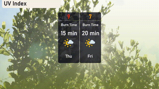 The UV index in Chicago is high today, Thursday, with a level of 9, leading to a burn time of just 15 minutes. For Friday, the UV index lowers slightly to 7, with a burn time of 20 minutes. Be sure to apply sunscreen and wear protective clothing to stay safe outdoors!