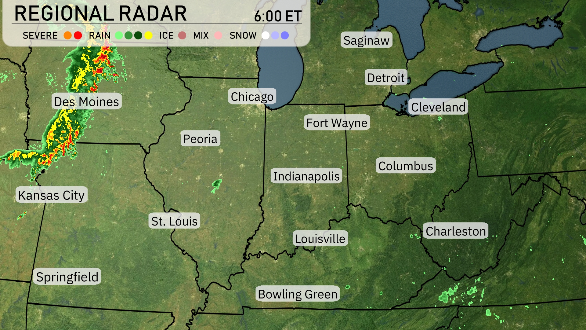 A line of severe thunderstorms is moving across Iowa, with Des Moines currently experiencing intense storm activity. The storms are advancing eastward towards Peoria, bringing heavy rain and potentially strong winds. In the Midwest, Chicago, Detroit, and Cleveland are presently clear, offering dry conditions for the day. Meanwhile, light showers are drifting around Kansas City, offering a gentle rainfall to the area.