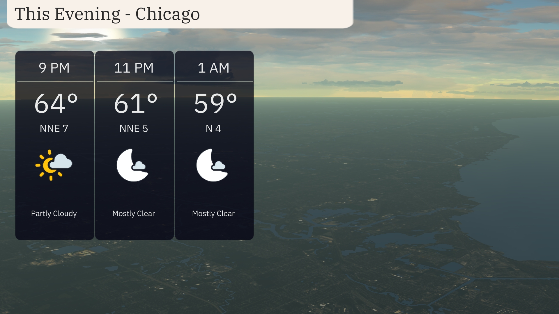 For this evening in Chicago, expect a partly cloudy sky transitioning to mostly clear conditions as the night progresses. Temperatures will dip from 64 degrees at 9 PM to 59 degrees by 1 AM. Winds will be calm, shifting from north-northeast at 7 mph to north at 4 mph by early morning. Enjoy a peaceful and cool evening by Lake Michigan.