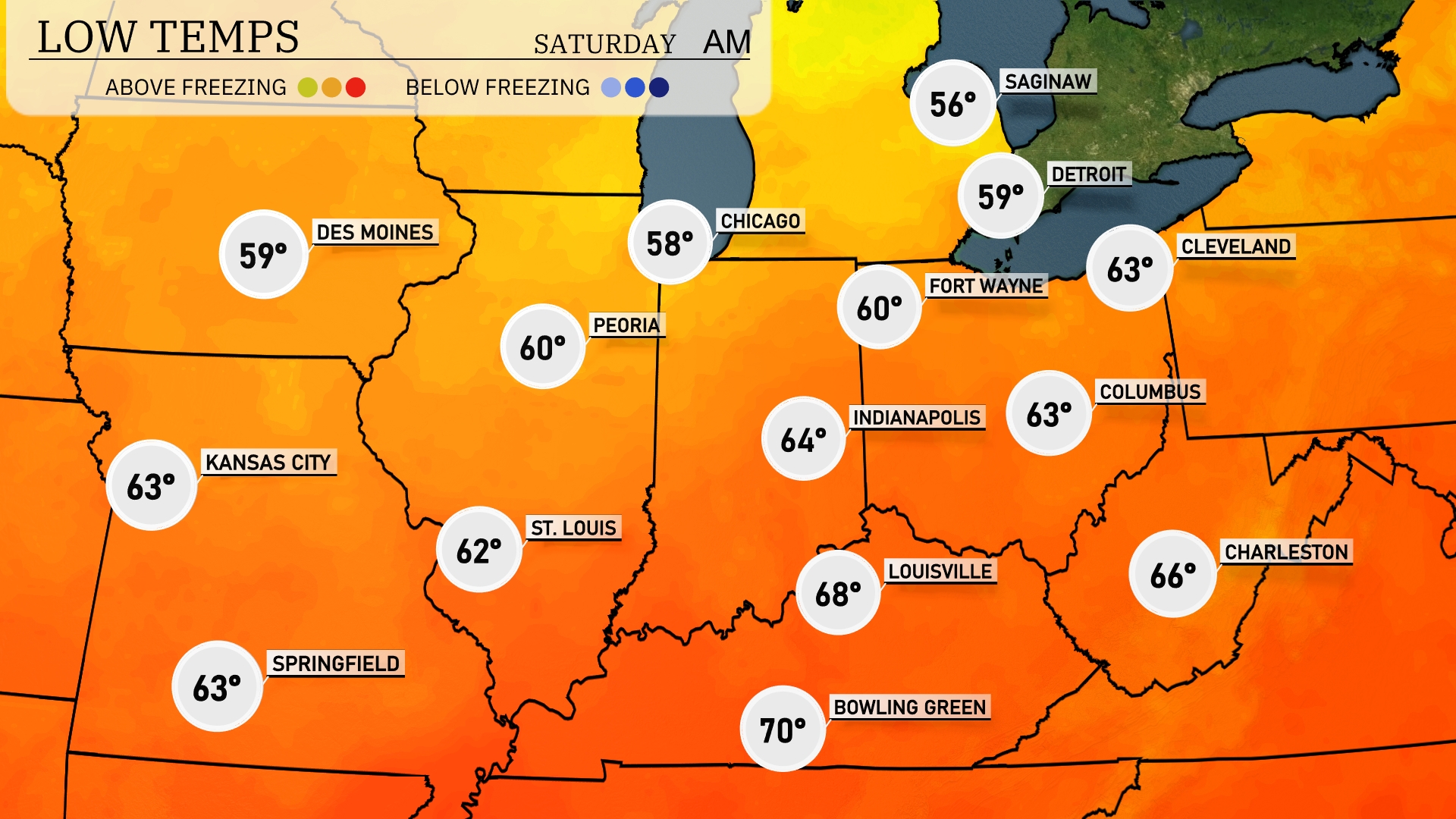Tonight, low temperatures will drop to 56 degrees in Saginaw and 59 degrees in Detroit. Chicago will see a low of 58 degrees, while Des Moines cools to 59 degrees. Expect a chillier night in Indianapolis with a low of 64 degrees and St. Louis at 62 degrees. Kansas City will remain slightly warmer at 63 degrees.
