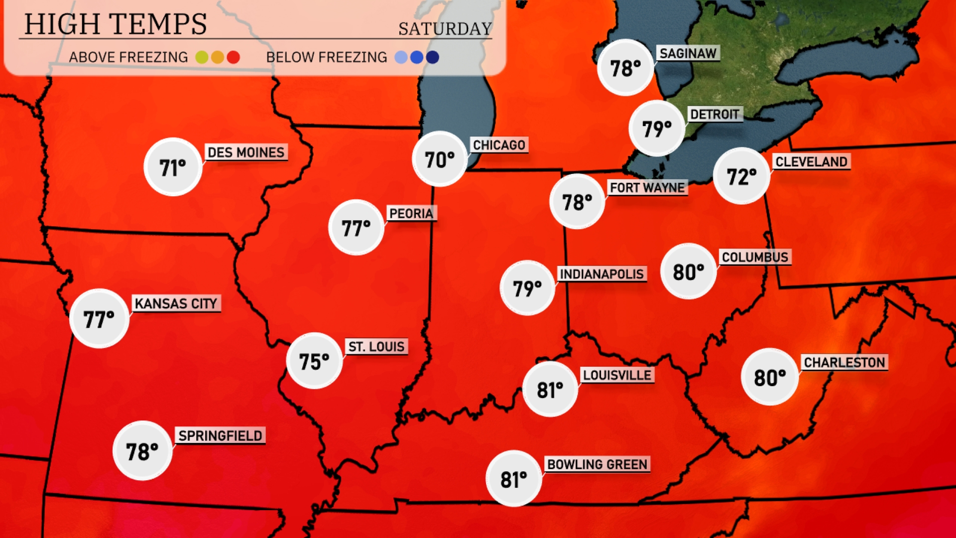 Tomorrow in the Midwest, high temperatures will soar into the upper 70s to low 80s. Indianapolis and Columbus are expected to hit 80 degrees, while Fort Wayne isn’t far behind at 78. Kansas City will see a high of 77, and both St. Louis and Peoria will reach 75 and 77 degrees, respectively. Chicago will remain on the cooler side, topping off at 70 degrees.