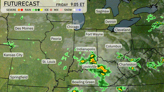 The Midwest will experience scattered thunderstorms moving from St. Louis to Columbus throughout Friday. Expect locally heavy rainfall, especially from Indianapolis to Louisville, which could lead to brief periods of urban flooding. The cold front associated will drop temperatures by about 5 to 10 degrees across the region, with cooler air settling in on Saturday. Some isolated severe storms are possible, particularly focusing on wind gusts and localized hail.