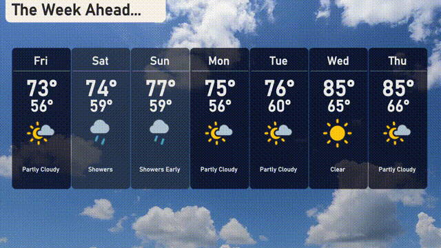 For the 7-day forecast in Chicago: Friday: We’ll have partly cloudy skies with a high of 73 degrees and a low of 56 degrees. Saturday: Showers are expected, with temperatures reaching a high of 74 degrees and a low of 59 degrees. Sunday: Showers early in the day with a high of 77 degrees and cooling to 59 degrees overnight. Monday: Partly cloudy with temperatures peaking at 75 degrees and dropping to 56 degrees at night. Tuesday: The sunshine continues with a high of 76 degrees and lows around 60 degrees. Wednesday: A clear day with a high of 85 degrees and a mild evening low of 65 degrees. Thursday: Partly cloudy skies with temperatures reaching a high of 85 degrees and an overnight low of 66 degrees.