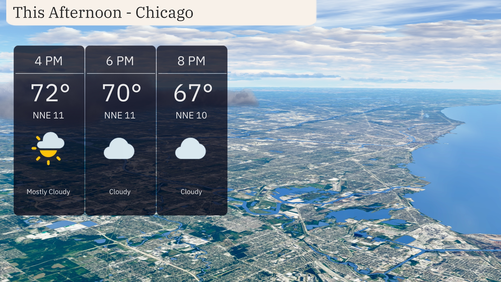 Expect a mostly cloudy afternoon in Chicago with temperatures starting at 72 degrees at 4 PM, gradually cooling to 67 degrees by 8 PM. Winds will be coming from the north-northeast at around 11 miles per hour, easing slightly to 10 miles per hour later.