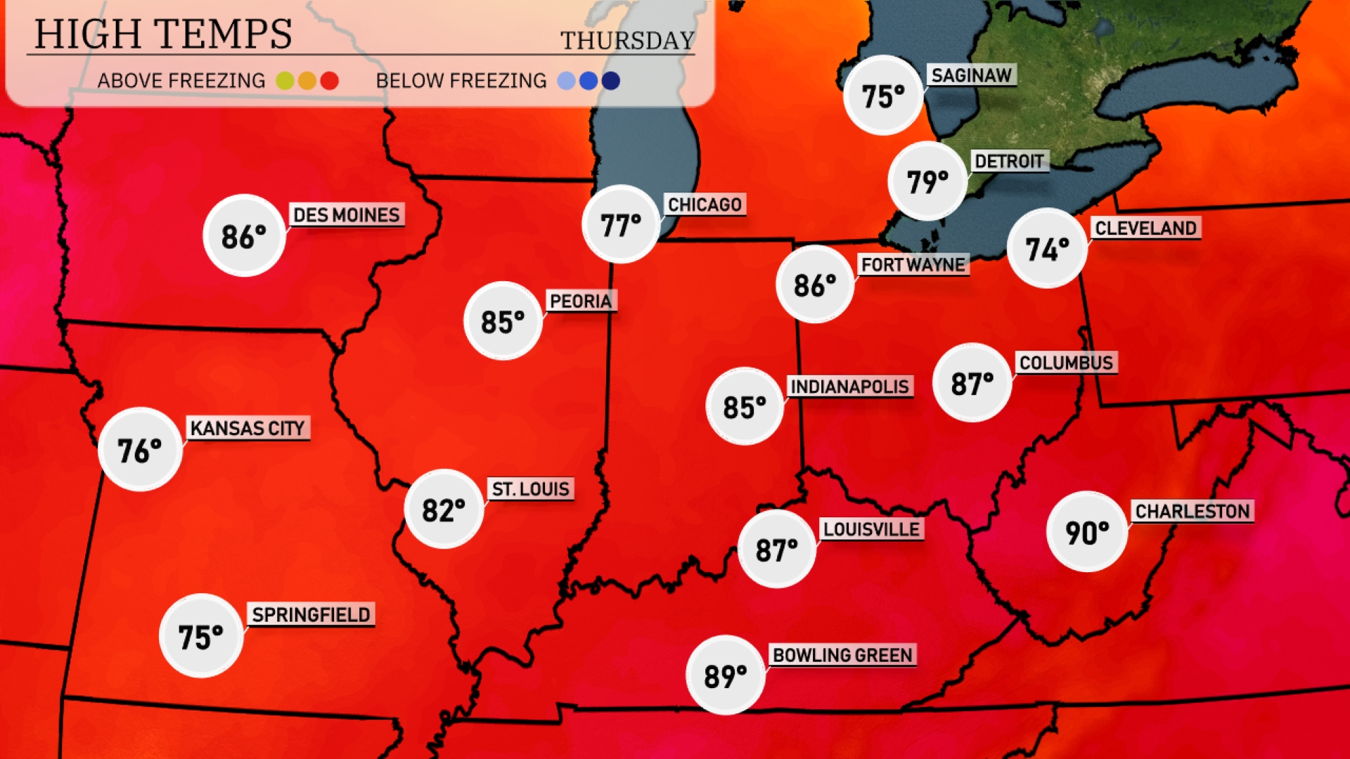 Tomorrow in Des Moines expect a very warm high of 86 degrees. Kansas City will see temperatures reach 83, while St. Louis is not far behind at 78 degrees. Indianapolis and Louisville will experience pleasant highs of 79 and 81 degrees, respectively. Cleveland will be cooler at 73, continuing a trend of below-average temperatures for the Great Lakes region.