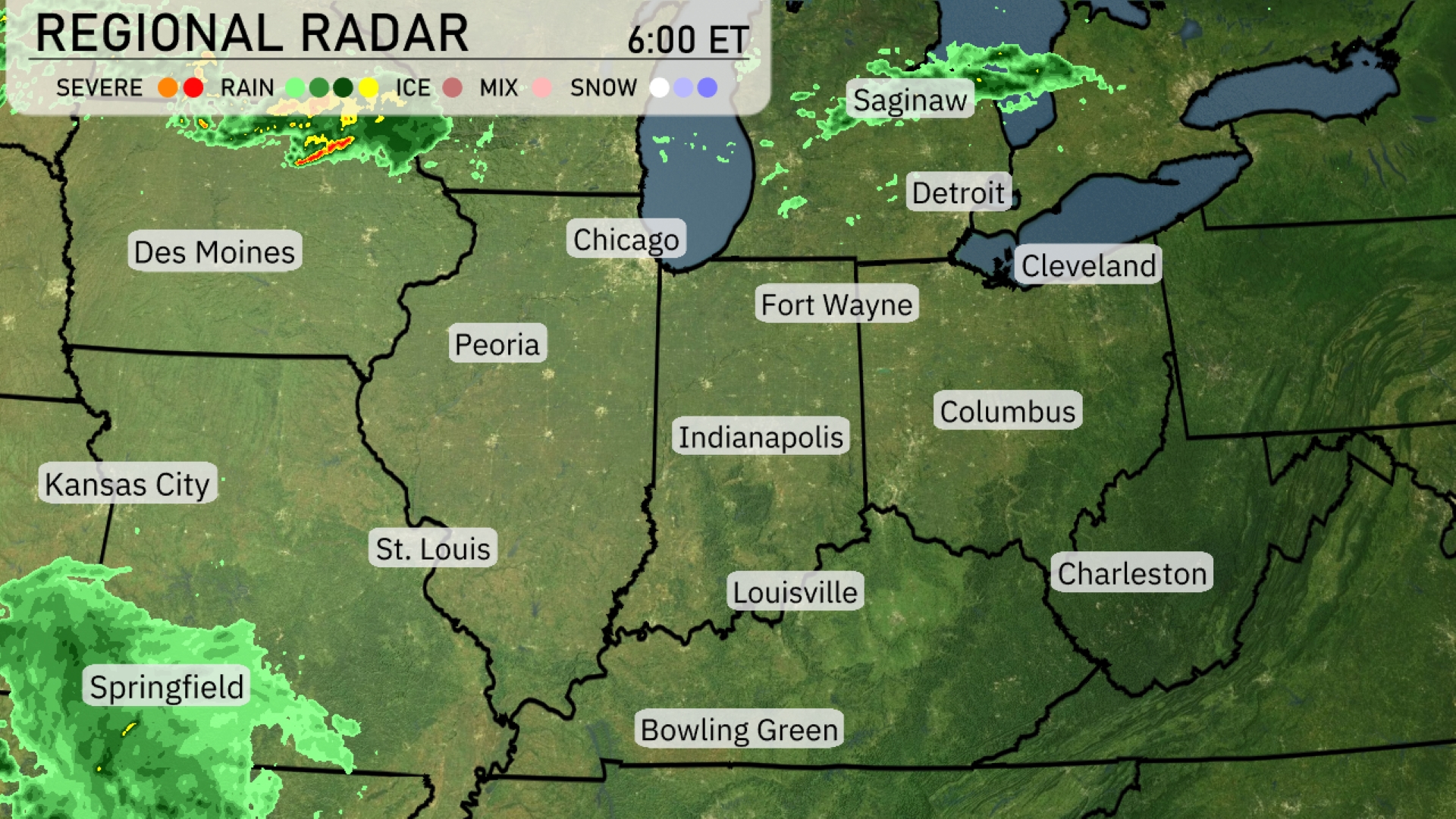 A frontal system is moving into the Midwest, bringing rain and a chance of thunderstorms starting Thursday morning, particularly affecting areas from Kansas City to Indianapolis. Watch for heavier downpours along the I-70 corridor in the afternoon, possibly leading to localized flooding. Temperatures will remain warm ahead of the front, but expect a cooler shift by Friday with clearing skies. In the northern stretches, such as Chicago and Detroit, showers are more scattered, with less severe weather activity anticipated.