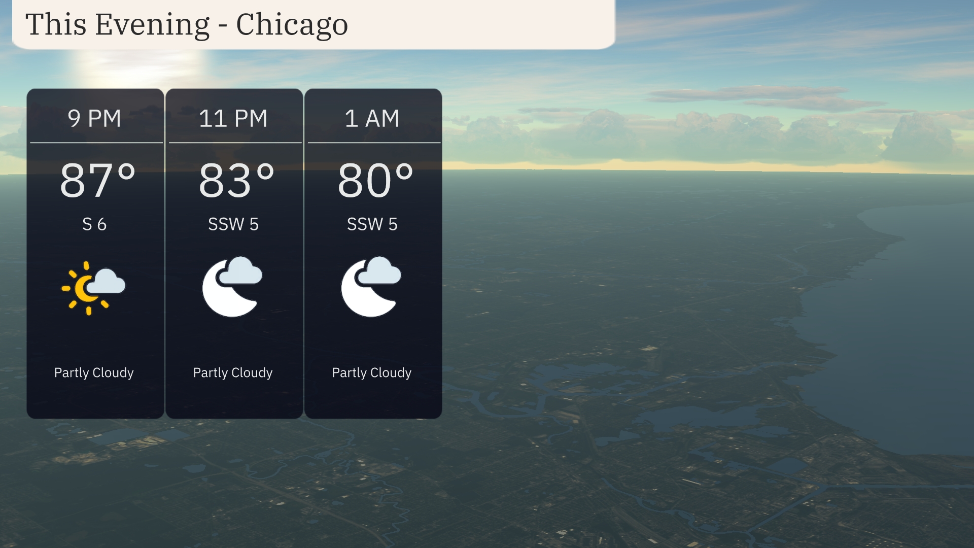 For this evening in Chicago, expect partly cloudy skies with temperatures decreasing from 87 degrees at 9 PM to 80 degrees by 1 AM. Winds will be gentle, blowing from the south to southwest at 5 to 6 miles per hour. Overall, a pleasant night with mild conditions is expected.
