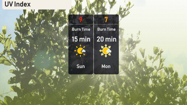 The UV index in Chicago will be high on Sunday with a rating of 9, indicating a burn time of approximately 15 minutes under direct sunlight. On Monday, expect a slightly lower UV index of 7, with a burn time of about 20 minutes. Be sure to take extra precautions when outdoors, including applying sunscreen and wearing protective clothing.