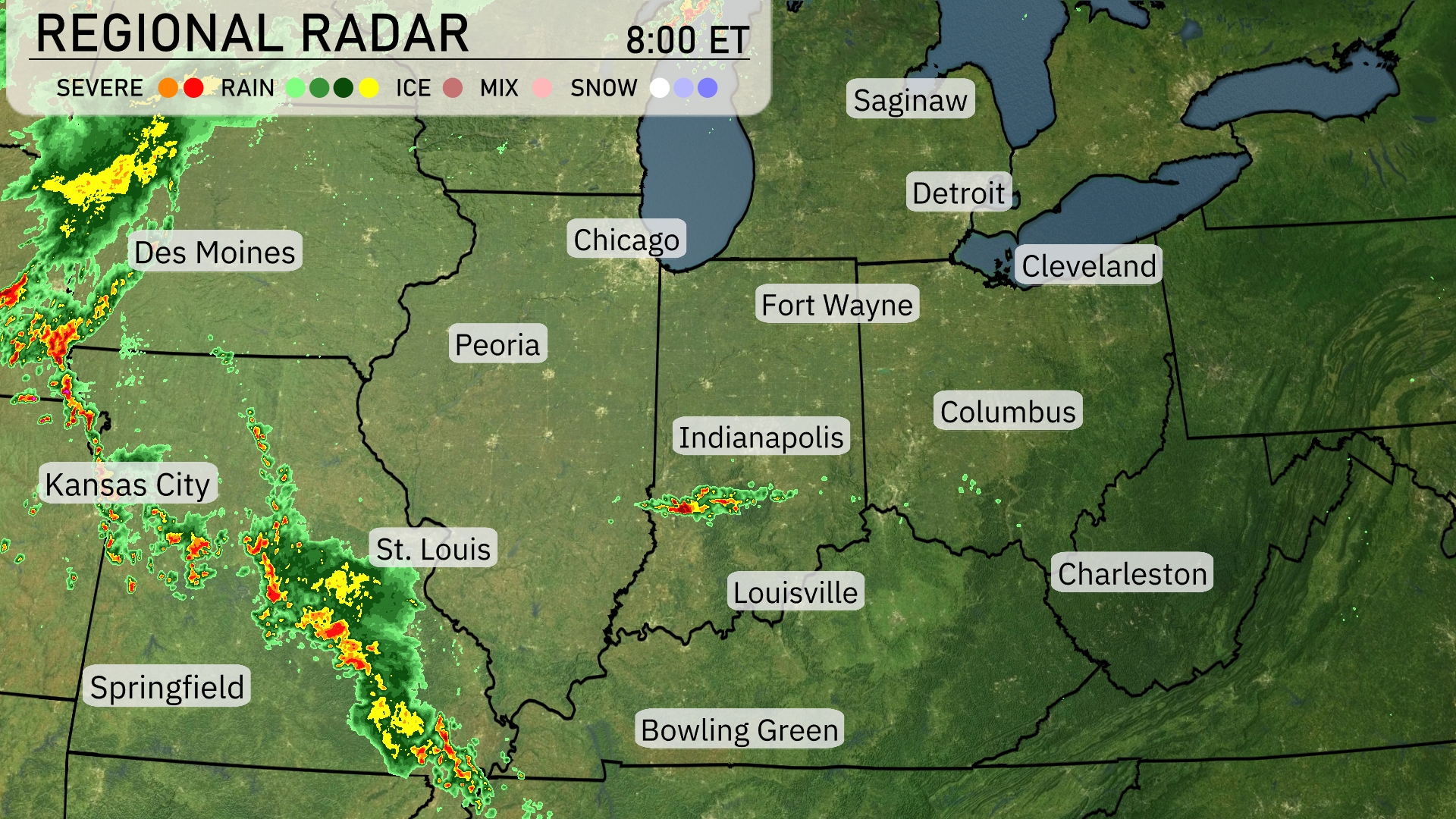 A line of storms is advancing across the Midwest, with intense weather currently affecting areas from St. Louis to Springfield. Kansas City and Des Moines are seeing rain mixed with severe weather conditions. Indianapolis and Louisville are under scattered light showers. It’s clear from Chicago extending to Cleveland and Detroit, offering calm weather conditions this morning.