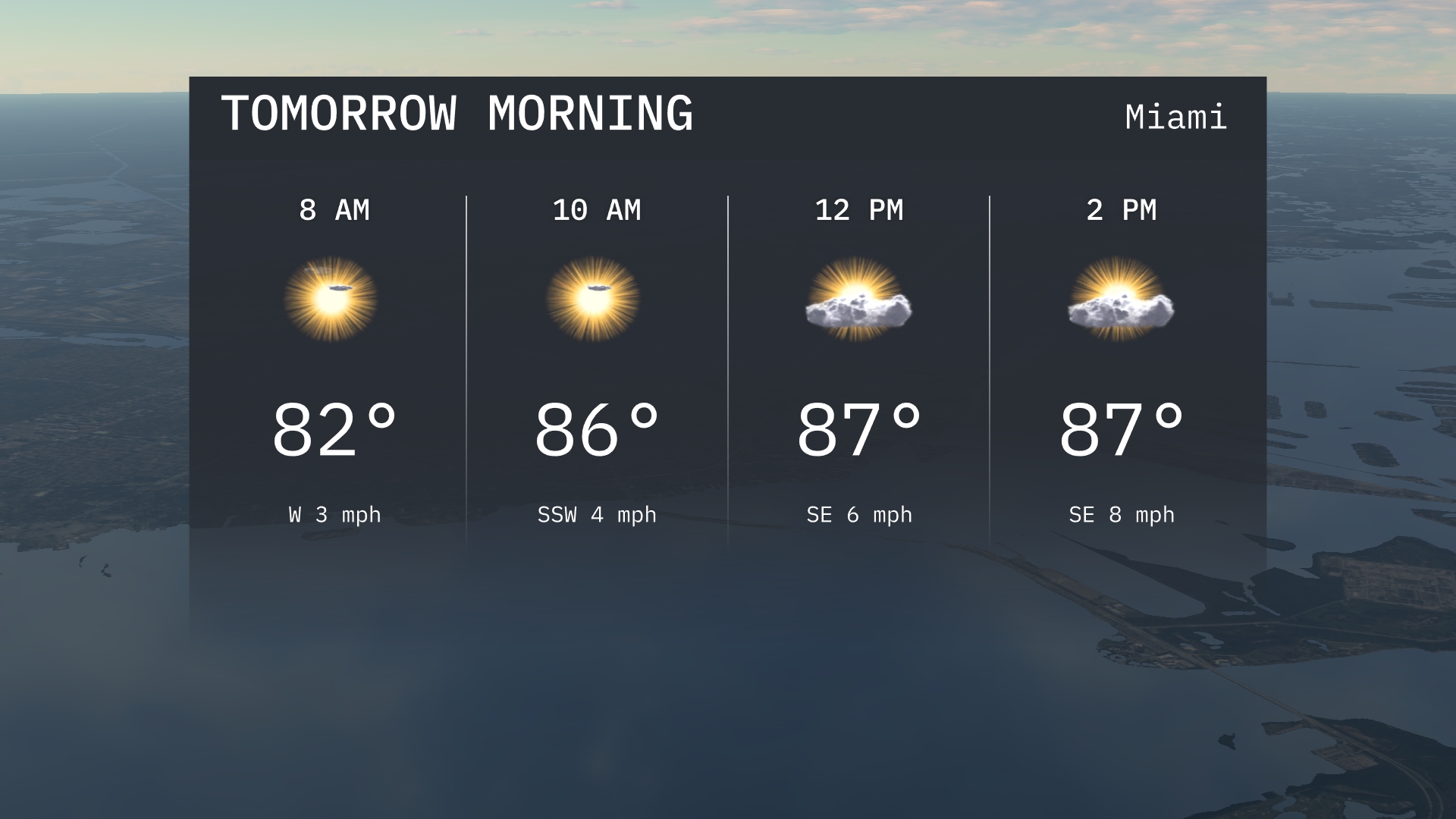 Tomorrow morning in Miami starts off warm with temperatures rising from 82 degrees at 8 AM to 87 degrees by noon. Expect clear skies early, transitioning to partially cloudy conditions by mid-morning. Winds will be light and variable.