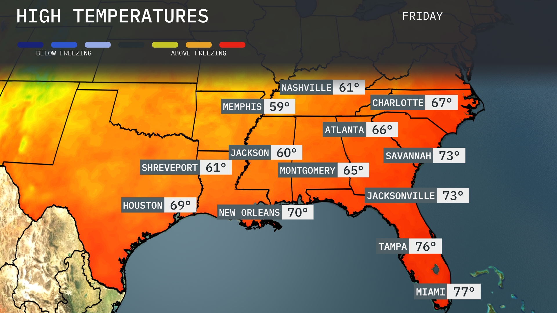 Tomorrow, Atlanta’s high will reach 66 degrees, while Nashville sees a cooler 61. Memphis will stay chilly at 59 degrees. In contrast, New Orleans will warm up to 70, and Tampa can expect a high of 76 degrees. Miami will be the warm spot, reaching 77 degrees, indicating a mild trend across the Southeast.