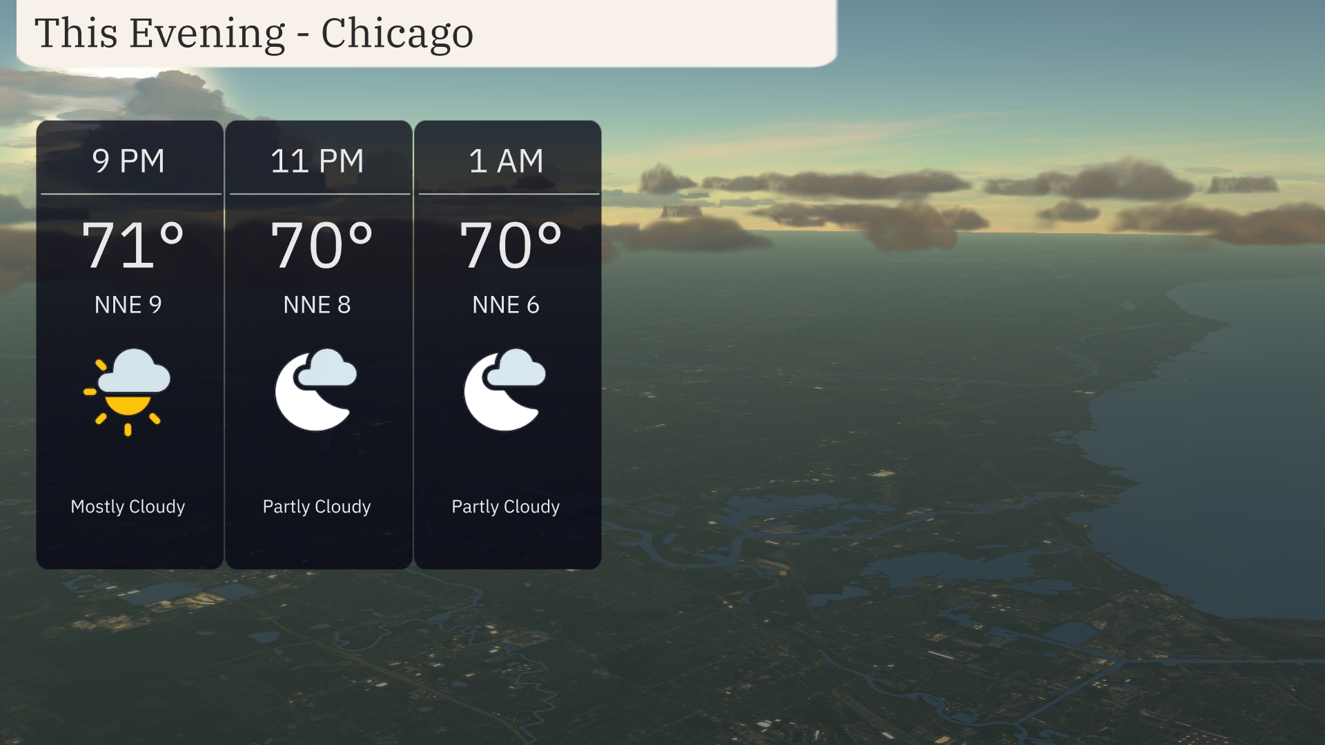 For this evening in Chicago, expect mostly clear skies transitioning to partly cloudy as the night progresses. Temperatures will gradually decrease from 71 degrees at 9 PM to 70 degrees by 1 AM. Winds will blow from the north-northeast at around 9 miles per hour, calming down to 6 miles per hour by early morning.