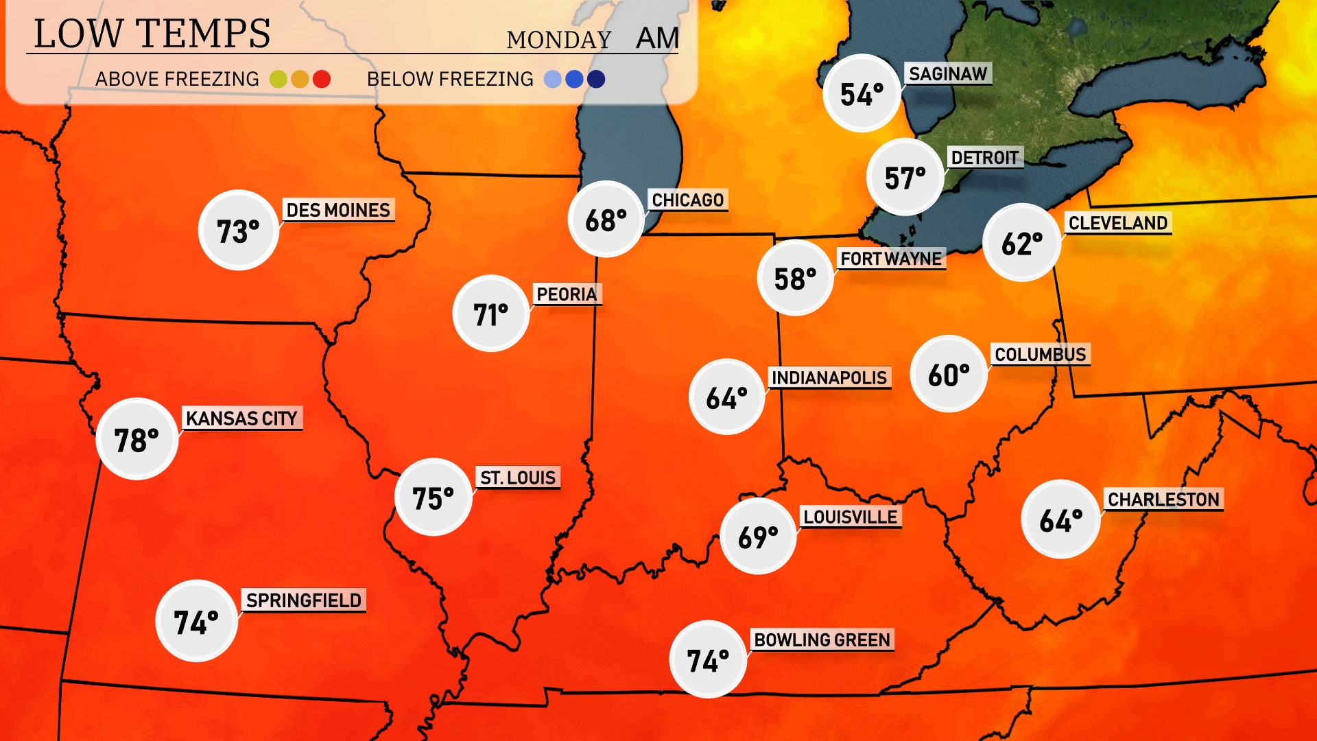 Tonight, temperatures will drop significantly across the Midwest. Chicago is expected to see a low of 68 degrees, while Fort Wayne will cool to 58 degrees. Indianapolis is looking at 64 degrees, and Columbus will have a low of 60 degrees. Expect Kansas City to remain a bit warmer at 78 degrees, but most areas will feel the cool air settling in.