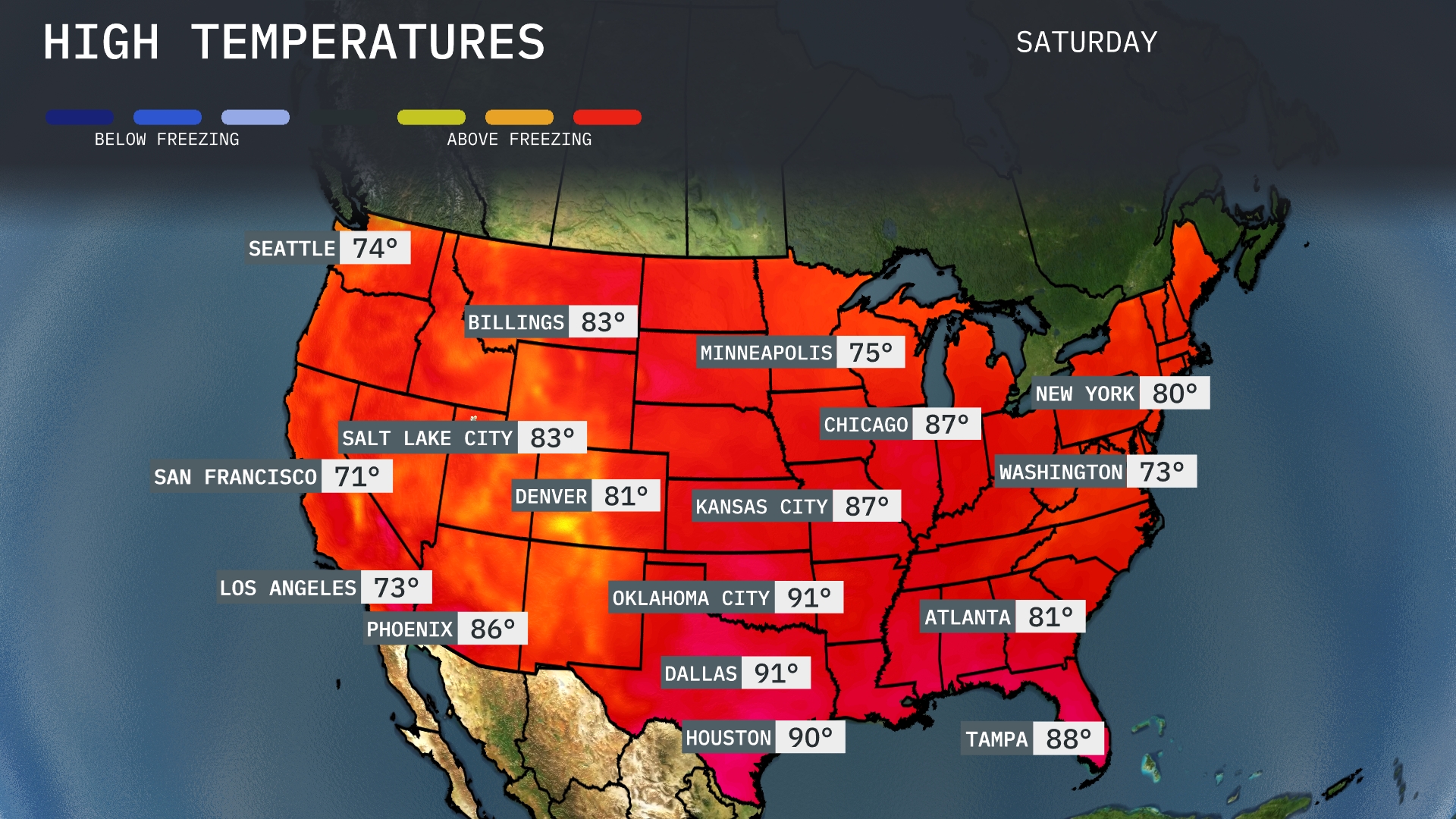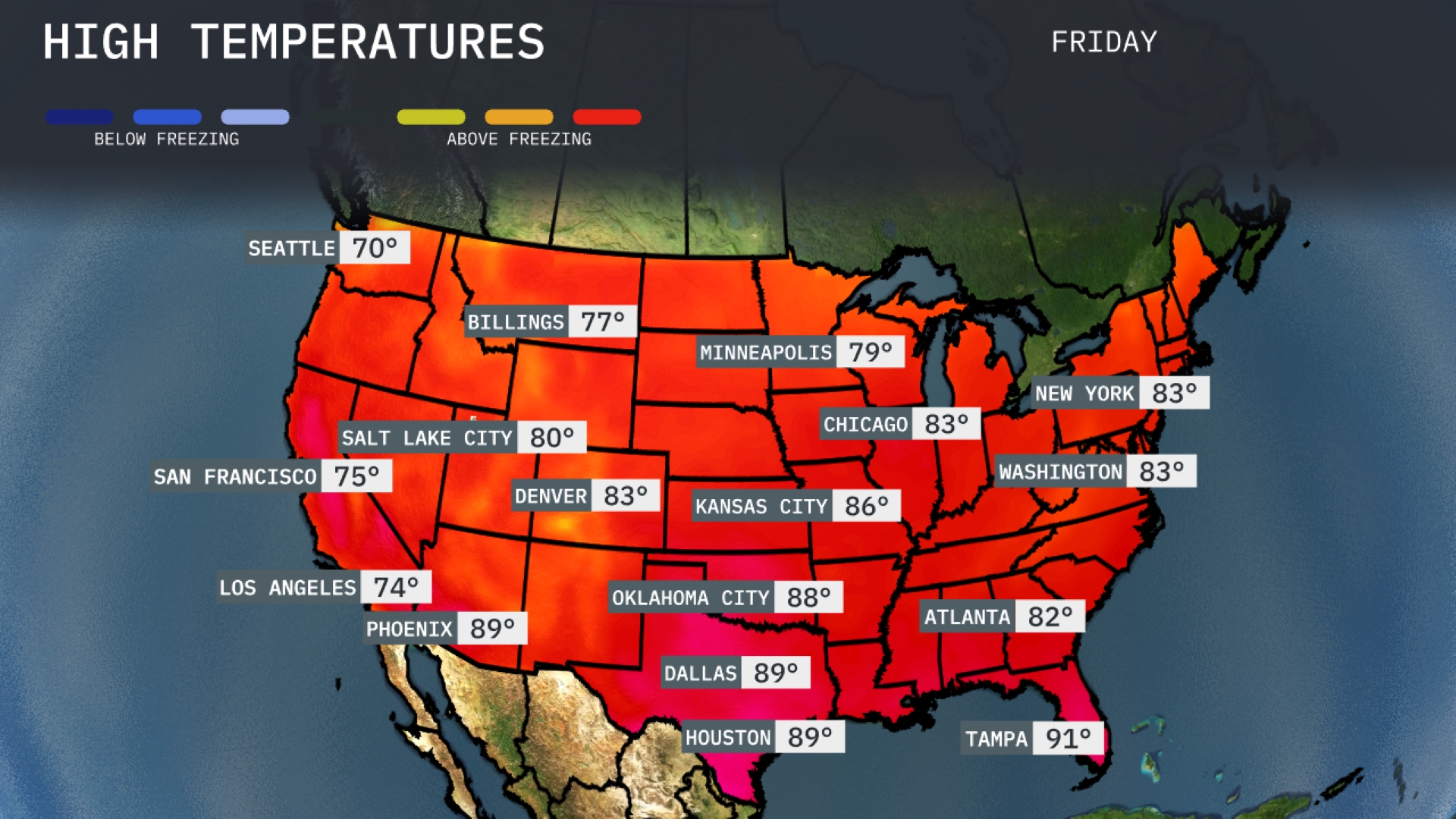 Today, temperatures across the nation reveal a striking contrast. In the Southeast, Tampa basks in a steamy high of 91 degrees, while nearby Atlanta is a bit cooler at 82 degrees. Over in the Midwest, Chicago reaches a pleasant 83 degrees, but Minneapolis is slightly warmer at 79. Meanwhile, the Southwest heats up with Phoenix hitting 89 degrees, while Los Angeles stays mild at 74 degrees, showcasing a notable temperature gradient.