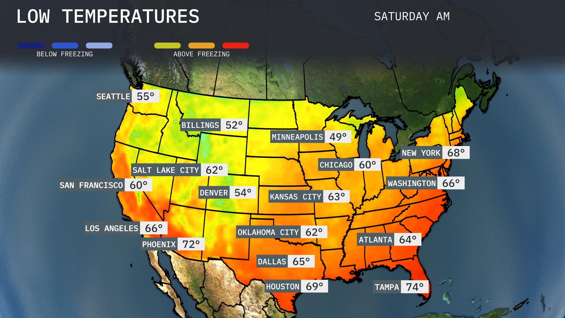 Now for the low temperatures tomorrow morning. In the Midwest, Minneapolis will dip to 49 degrees, while Chicago isn’t far behind at 60. Heading south, Kansas City will cool down to 63 degrees, and Dallas will rest at a comfortable 65. In the Southeast, Atlanta will wake up to 64 degrees, and further south, Tampa remains warmer at 74 degrees.