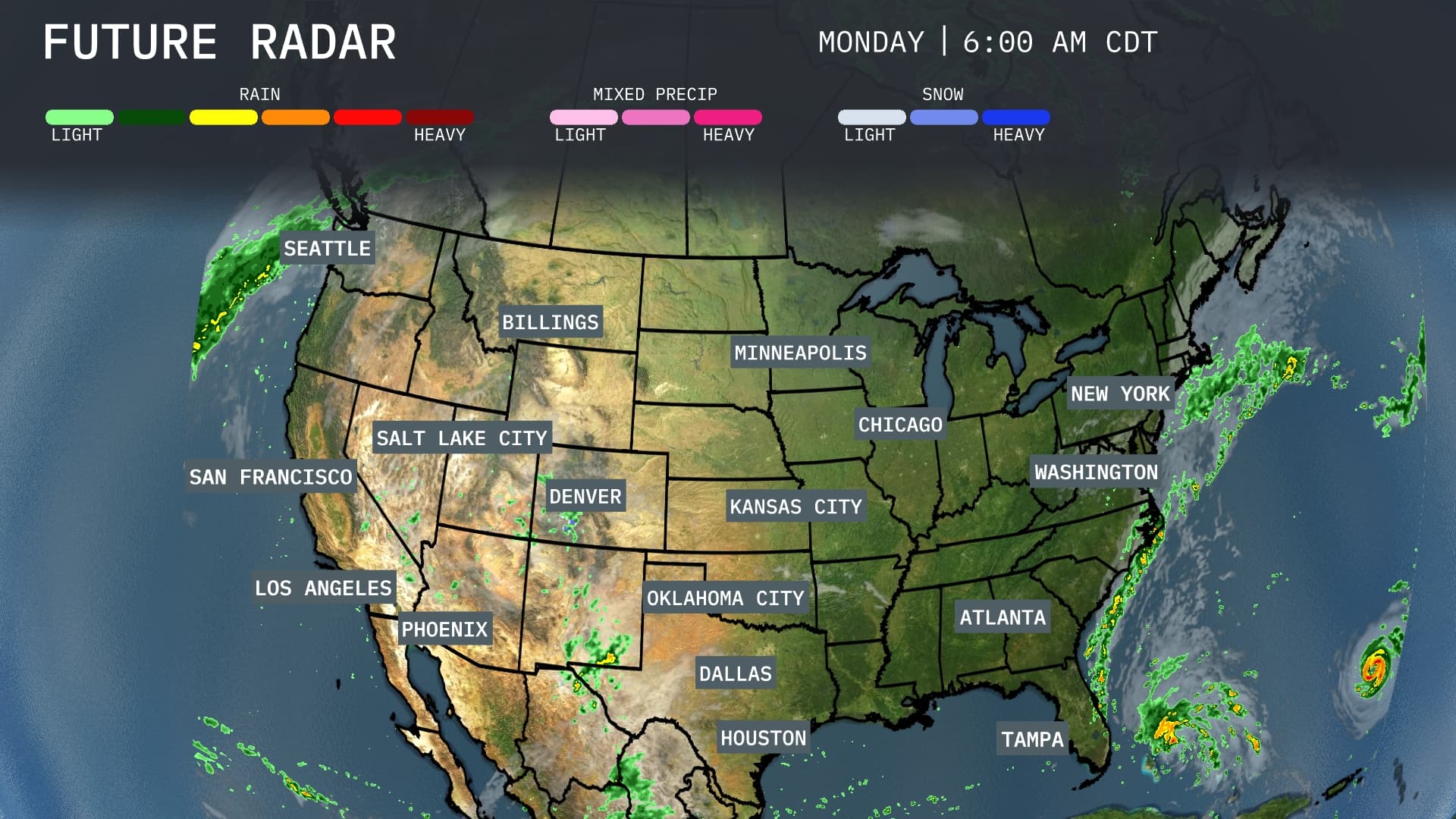 Farther west, the Pacific Northwest is calm, with Seattle mostly clear except for some isolated rain showers. Across the mountains near Billings, wet weather conditions are anticipated, adding to the day’s gloomy mood.