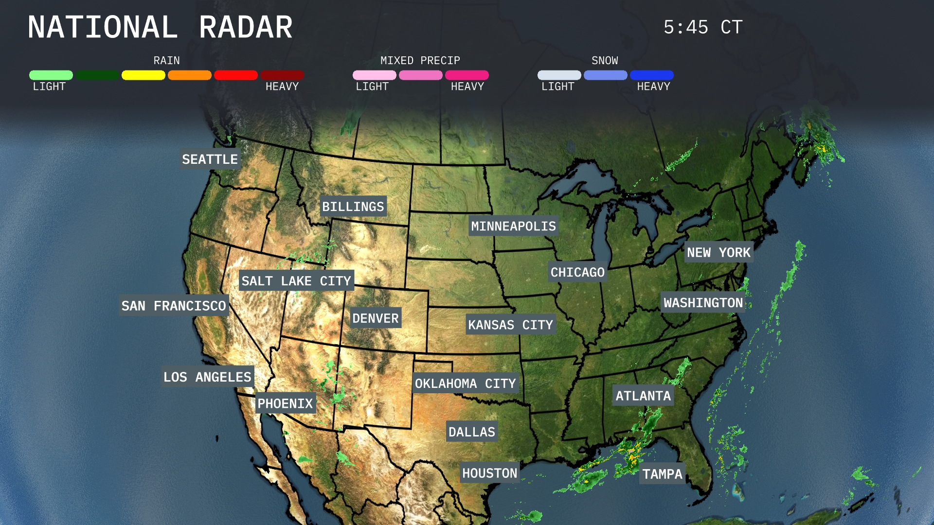 A coastal storm system is making its way along the East Coast, with Washington, D.C., and New York experiencing steady rainfall, bringing soggy conditions throughout the day. Atlanta, too, is seeing rain that could slow down afternoon and evening activities. Meanwhile, in the Central Plains, Oklahoma City is dealing with localized rain showers, while Dallas remains dry and overcast.