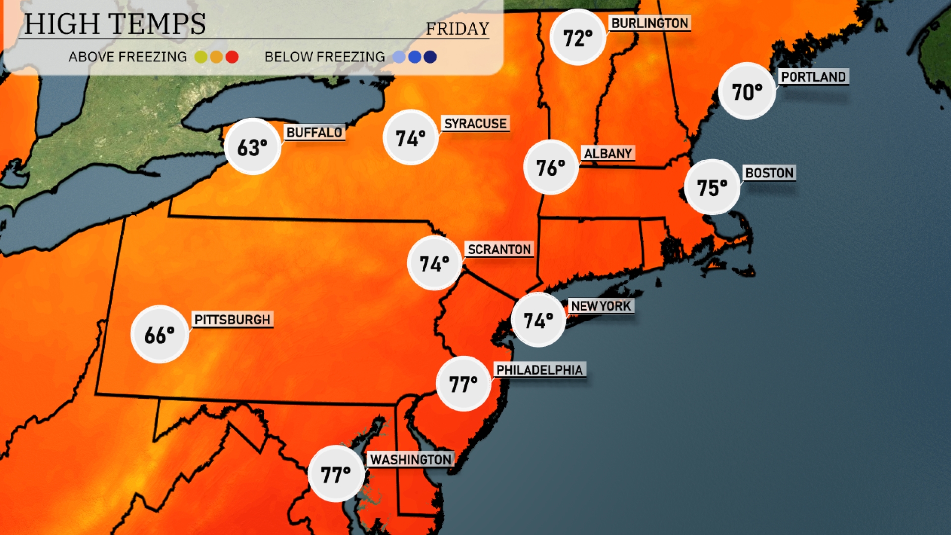 Tomorrow New York City is set to reach a high of 70 degrees, while Philadelphia will match that with the same temperature. Boston is expected to see a high of 69 degrees, with clear skies allowing for warm conditions. Farther north, Syracuse will struggle to reach just 56 degrees, showing a stark contrast. Pittsburgh also stays comfortable at 61 degrees, rounding out a warm day for much of the region.